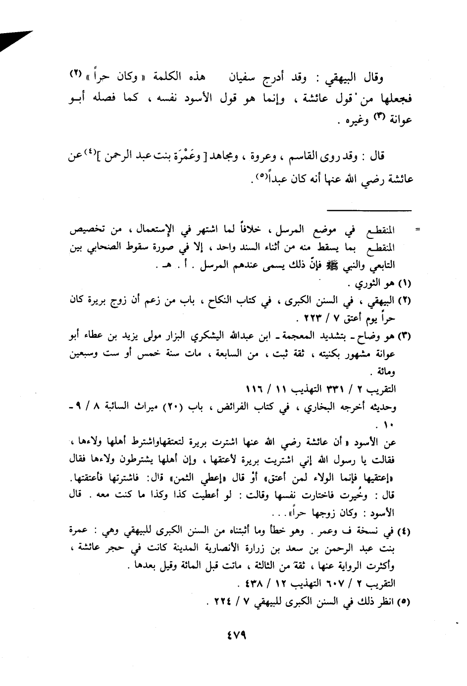 وَقَالَ الْبَيْهَقِيّ وَقد أدرح سُفْيَان هَذِه الْكَلِمَة وَكَانَ حرا فَجَعلهَا من قَول عَائِشَة وَإِنَّمَا هُوَ قَول الاسود نَفسه كَمَا فَصله أَبُو عوَانَة وَغَيره