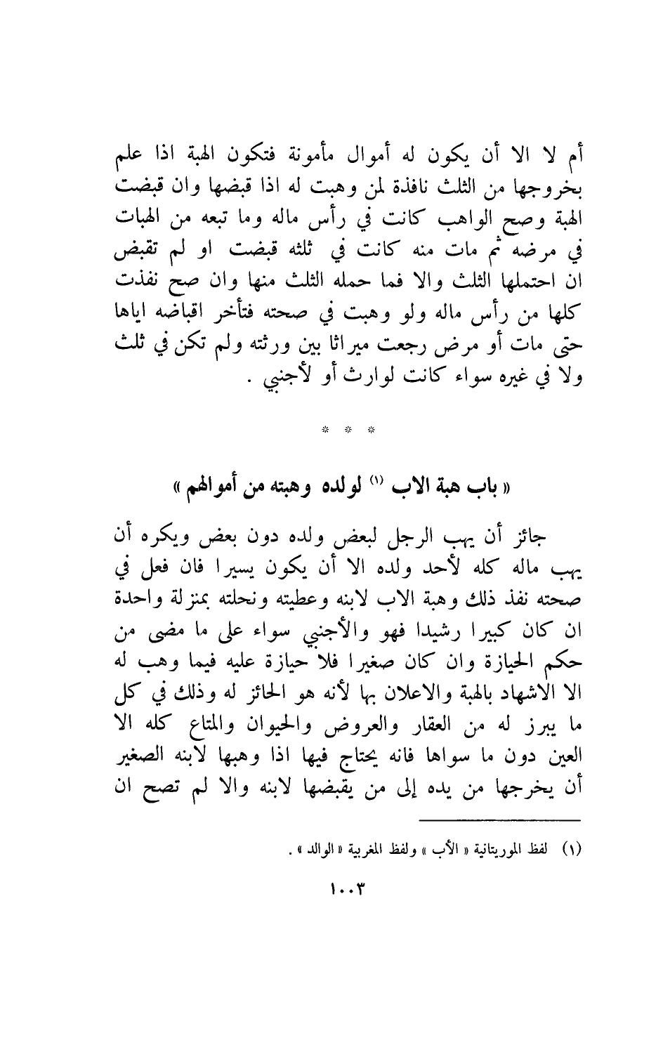 ام لا الا ان يكون له اموال مأمونه فتكون الهبه اذا علم بخروجها من الثلث نافذه لمن وهبت له اذا قبضها وان قبضت الهبه وصح الواهب كانت في رأس ماله وما تبعه من الهبات في مرضه ثم مات منه كانت في ثلثه قبضت او لم تقبض ان احتملها الثلث والا فما حمله الثلث منها وان صح نفذت كلها من رأس ماله ولو وهبت في صحته فتأخر اقباضه اياها حتى مات او مرض رجعت ميراثا بين ورثته ولم تكن في ثلث ولا في غيره سواء كانت لوارث او لاجنبي