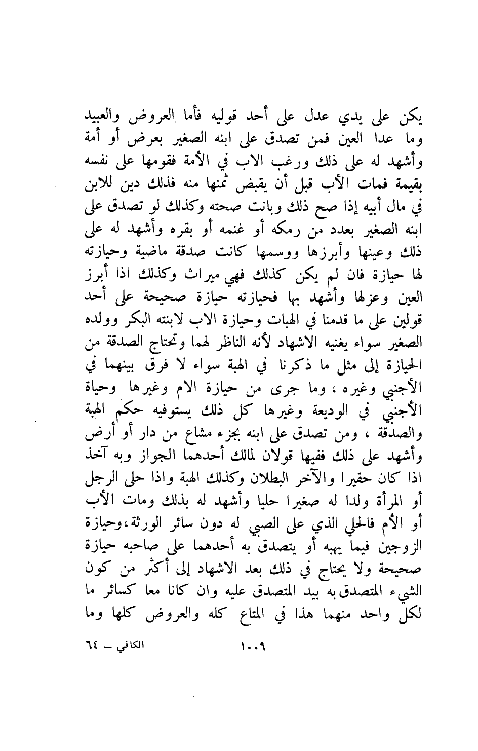 يكن على يدي عدل على احد قوليه فأما العروض والعبيد وما عدا العين فمن تصدق على ابنه الصغير بعرض او أمه واشهد له على ذلك ورغب الاب في الامه فقومها على نفسه بقيمة فمات الاب قبل ان يقبض ثمنها منه فذلك دين للابن في مال ابيه اذا صح ذلك وبانت صحته وكذلك لو تصدق على ابنه الصغير بعدد من رمكه او غنمه او بقره واشهد له على ذلك وعينها وابرزها ووسمها كانت صدقه ماضيه وحيازته لها حيازه فإن لم يكن كذلك فهي ميراث وكذلك اذا ابرز العين وعزلها واشهد بها فحيازته حيازة صحيحه على حد قولين على ما قدمنا في الهبات وحيازة الاب لابنته البكر وولده الصغير سواء يغنيه الاشهاد لانه الناظر لهما وتحتاج الصدقه من الحيازه الى مثل ما ذكرذ نا في الهبة سواء لافرق بينهما في الاجنبي وغيره وما جرى من حيازة الام وغيرها وحياة الاجنبي وغيره وما جرى من حيازة الام وغيرها وحياة الأجنبي في الوديعه وغيرها كل ذلك يستوفيه حكم الهبة والصدقه ومن تصدق على ابنه بجزء مشاع من دار او ارض واشهد على ذلك ففيها قولان المالك احدهما الجواز وبه آخذ اذا كان حقيرا والاخر البطلان وكذلك الهبة واذا حلى الرجل او المرأة ولدا له صغيرا حليا وأشهد له بذلك ومات الاب او الام فالحلي الذي على الصبي له دون سائر الورثه وحيازة الزوجين فيما يهبه او يتصدق به احدهما على صاحبه حيازة صحيحه ولا يحتاج في ذلك بعد الاشهاد الى اكثر من كون الشيء المتصدق به بيد المتصدق عليه وان كانا معا كسائر ما لكل واحد منهما هذا في المتاع كله والعروض كلها وما
