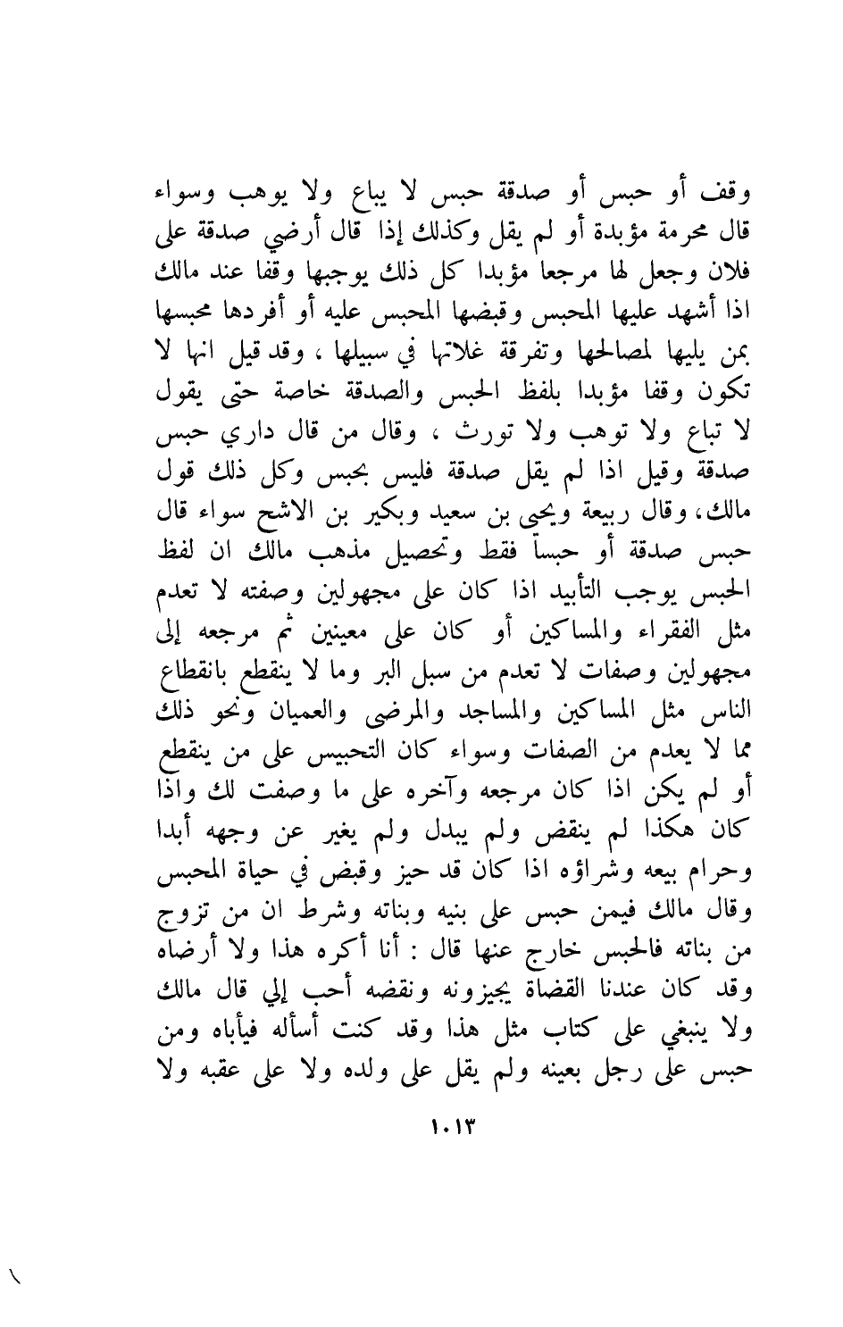 وقف او حبس او صدقه حبس لايباع ولا يوهب وسواء قال محرمه مؤبده او لم يقل وكذلك اذا قال ارضي صدقة على فلان وجعل له مرجعا مؤبدا كل ذلك يوجبها وقفا عند مالك اذا أشهد عليها المحبس وقبضها المحبس عليه او أفردها محبسها بمن يليها لمصالحها وتفرقه غلاتها في سبيلها وقد قيل انها لاتكون وقفا مؤبدا بلفظ الحبس والصدقه خاصة حتى يقول لا تباع ولا توهب ولا تورث وقال من قال داري حبس صدقة وقيل اذا لم يقل صدقه فليس بحبس وكل ذلك قول مالك وقال ربيعه ويحيى بن سعيد وبكير بن الاشح سواء قال حبس صدقه او حبسا فقط وتحصيل مذهب مالك ان لفظ الحبس يوجب التأبيد اذا كان على مجهولين وصفته لا تعدم مثل الفقراء والمساكين او كان على معينين ثم مرجعه الى مجهولين وصفات لا تعدم في سبل البر وما لا ينقطع بانقطاع الناس مثل المساكين والمساجد والمرضى والعميان ونحو ذلك مما لايعدم من الصفات وسواء كان التحبيس على من ينقطع او لم يكن اذا كان مرجعه واخره على ما وصفت لك واذا كان هكذا لم ينقص ولم يبدل ولم يغير عن وجهه أبدا وحرام بيعه وشراؤه اذا كان قد حيز وقبض في حياة المحبس وقال مالك فيمن حبس على بنيه وبناته وشرط أن من تزوج من بناته فالحبس خارج عنها قال أنا اكره هذا ولا ارضاه وقد كان عندنا القضاة يجيزونه ونقضه احب الي قال مالك ولا ينبغي على كتاب مثل هذا وقد كنت اسأله فيأباه ومن حبس على رجل بعينه ولم يقل على ولده ولا على عقبه ولا