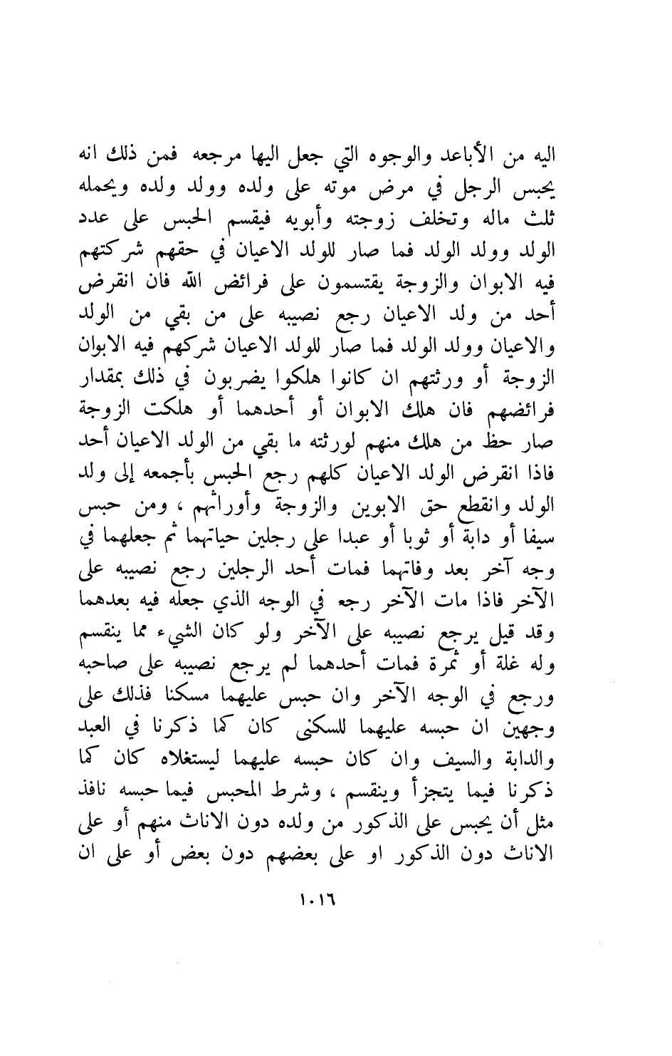 اليه من الاباعد والوجوه التي جعل اليها مرجعه فمن ذلك انه يحبس الرجل في مرض موته على ولده وولد ولده ويحمله ثلث ماله وتخلف زوجته وابويه فيقسم الحبس على عدد الولد وولد الولد فما صار للولد الاعيان في حقهم شركتهم فيه الابوان والزوجه يقتسمون على فرائض الله فإن انقرض احد من ولد الاعيان رجع نصيبه على من بقي من الولد والاعيان وولد الولد فما صار للولد الاعيان شركهم فيه الابوان الزوجه او ورثتهم ان كانوا هلكوا يضربون في ذلك بمقدار فرائضهم فإن هلك الابوان او احدهما او هلكت الزوجه صار حظ من هلك منهم لورثته ما بقي من الولد الاعيان احد فإذا انقرض الولد الاعيان كلهم رجع الحبس بأجمعه الى ولد الولد وانقطع حق الابوين والزوجه وأوراثهم ومن حبس سيفا او دابه او ثوبا او عبدا على رجلين حياتهما ثم جعلهما في وجه اخر بعد وفاتهما فمات احد الرجلين رجع نصيبه على الاخر فاذا مات الاخر رجع في الوجه الذي جعله فيه بعدهما وقد قيل يرجع نصيبه على الاخر ولو كان الشيء مما ينقسم وله غلة او ثمره فمات احدهما لم يرجع نصيبه على صاحبه ورجع في الوجه الاخر وان حبس عليهما مسكنا فذلك على وجهين ان حبسه عليهما للسكنى كان كما ذكرنا فى العبد والدابة والسيف وإن كان حبسه عليهما ليستغلاه كان كما ذكرنا فيما يتجزأ وينقسم وشرط المحبس فيما حبسه نافذ مثل ان يحبس على الذكور من ولده دون الاناث منهم او على الإناث دون الذكور او على بعضهم دون بعض او على ان