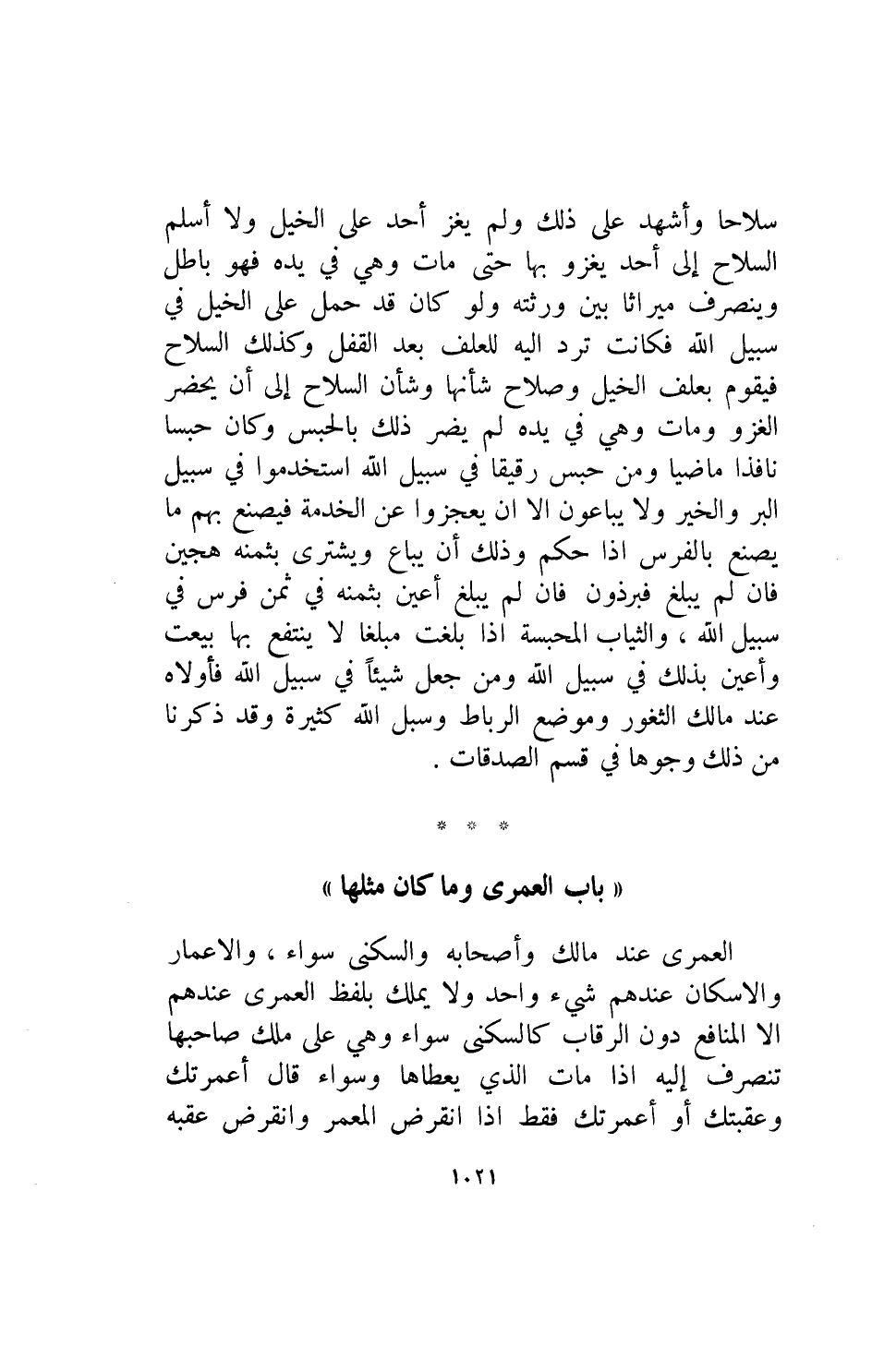 سلاحا وأشهد على ذلك ولم يغز على الخيل ولا اسلم السلاح الى احد يغزو بها حتى مات وهي في يده فهو باطل وينصرف ميراثا بين ورثته ولو كان قد حمل على الخيل في سبيل الله فكانت ترد إليه للعلف بعد القفل وكذلك السلاح فيقوم بعلف الخيل وصلاح شأنا وشأن السلاح الى ان يحضر الغزو ومات وهي في يده لم يضر ذلك بالحبس وكان حبسا نافذا ماضيا ومن حبس رقيقا في سبيل الله استخدموا في سبيل الله البر والخير ولا يباعون الا ان يعجزوا عن الخدمه فيصنع بهم ما يصنع بالفرس اذا حكم وذلك ان يباع ويشترى بثمنه هجين فإن لم يبلغ فبرذون فإن لم يبلغ أعين بثمنه في ثمن فرس في سبيل الله والثياب المحبسه اذا بلغت مبلغا لا ينتفع بها بيعت وأعين بذلك في سبيل الله ومن جعل شيئا في سبيل الله فأولاه عند مالك الثغور وموضع الرباط وسبل الله كثيره وقد ذكرنا من ذلك وجوها في قسم الصدقات