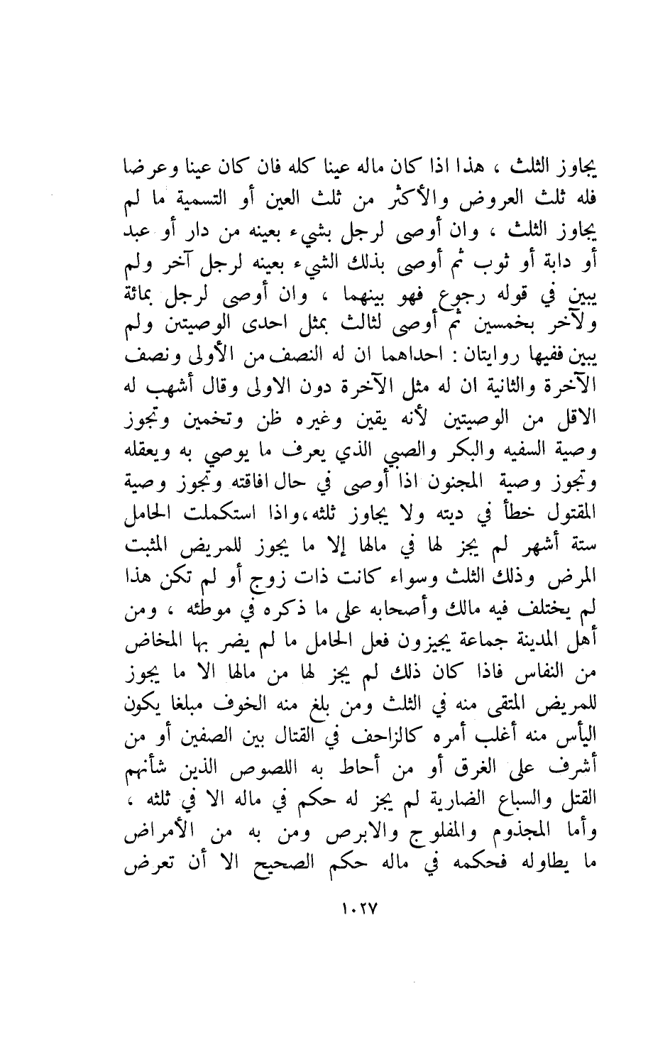 يجاوز الثلث هذا اذا كان ماله عينا كله فإن كان عينا وعرضا فله ثلث العروض والاكثر من ثلث العين او التسميه مالم يجاوز الثلث وان أوصى لرجل بشيء بعينه من دار أو عبد أو دابة أو ثوب ثم أوصى بذلك الشيء بعينه لرجل آخر ولم يبين في قوله رجوع فهو بينهما وان أوصى لرجل بمائة ولاخر بخمسين ثم اوصى لثالث بمثل احدى الوصيتين ولم يبين ففيها روايتان احداهما ان له النصف من الاولى ونصف الاخرة والثانية أن له مثل الاخرة دون الاولى وقال أشهب له الاقل من الوصيتين لأنه يقين وغيره ظن وتخمين وتجوز وصية السفيه والبكر والصبي الذي يعرف ما يوصى به ويعقله وتجوز وصية المجنون اذا اوصى في حال افاقته وتجوز وصية المقتول خطأ في ديته ولا يجوز ثلثه وإذا استكملت الحامل ستة أشهر لم يجز لها في مالها إلا ما يجوز للمريض المثبت المرض وذلك الثلث وسواء كانت ذات زوج أو لم تكن هذا لم يختلف فيه مالك وأصحابه على ما ذكره في موطئه ومن أهل المدينه جماعة يجيزون فعل الحامل مالم يضر بها المخاض من النفاس فإذا كان ذلك لم يجز لها من مالها إلا ما يجوز للمريض المتقى منه في الثلث ومن بلغ منه الخوف مبلغا يكون اليأس منه أغلب أمره كالزاحف في القتال بين الصفين أو من أشرف على الغرق أو من أحاط به اللصوص الذين شأنهم القتل والسباع الضارية لم يجز له حكم في ماله الا في ثلثه وأما المجذوم والمفلوج والابرص ومن به من الامراض ما يطاوله فحكمه في ماله حكم الصحيح إلا ان تعرض