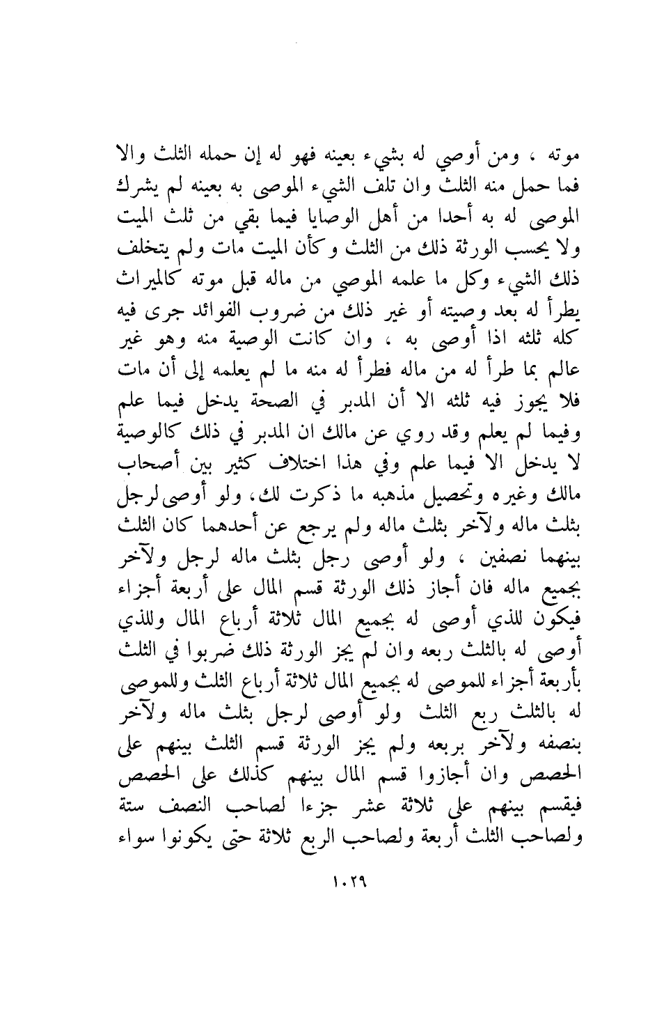 موته ومن أوصى له بشيء بعينه فهو له إن حمله الثلث وإلا فما حمل من الثلث وان تلف الشيء الموصى به بعينه لم يشرك الموصى له به احدا من اهل الوصايا فيما بقي من الثلث الميت ولا يحسب الورثه ذلك من الثلث وكأن الميت مات ولم يتخلف ذلك الشيء وكل ما عمله الموصي من ماله قبل موته كالميراث يطرأ له بعد وصيته أو غير ذلك من ضروب الفوائد جرى فيه كله ثلثه اذا أوصى به وان كانت الوصية منه وهو غير عالم بما طرأ له من ماله فطرأ منه مالم يعلمه الى ان مات فلا يجوز فيه ثلثه إلا أن المدبر في الصحه يدخل فيما علم وفيما لم يعلم وقد روي عن مالك أن المدبر في ذلك كالوصية لا يدخل الافيما علم وفي هذا اختلاف كثير بين اصحاب مالك وغيره وتحصيل مذهبه ما ذكرت لك ولو أوصى لرجل بثلث ماله ولاخر بثلث ماله ولم يرجع عن احدهما كان الثلث بينهما نصفين ولو اوصى رجل بثلث ماله لرجل ولاخر بجميع ماله فإن أجاز ذلك الورثه قسم المال على اربعه أجزاء فيكون للذي أوصى له بجميع المال ثلاثة أرباع المال وللذي أوصى له بالثلث ربعه وان لم يجز الورثه ذلك ضربوا في الثلث بأربعه اجزاء للموصي له بجميع المال ثلاثة أرباع الثلث وللموصي له بالثلث ربع الثلث ولو أوصى لرجل بثلث ماله ولآخر بنصفه ولآخر بربعه ولم يجز الورثه قسم الثلث بينهم على الحصص وإن اجازوا قسم المال بينهم كذلك على الحصص فيقسم بينهم على ثلاثة عشر جزءا لصاحب النصف ستة ولصاحب الثلث اربعة ولصاحب الربع ثلاثة حتى يكونوا سواء