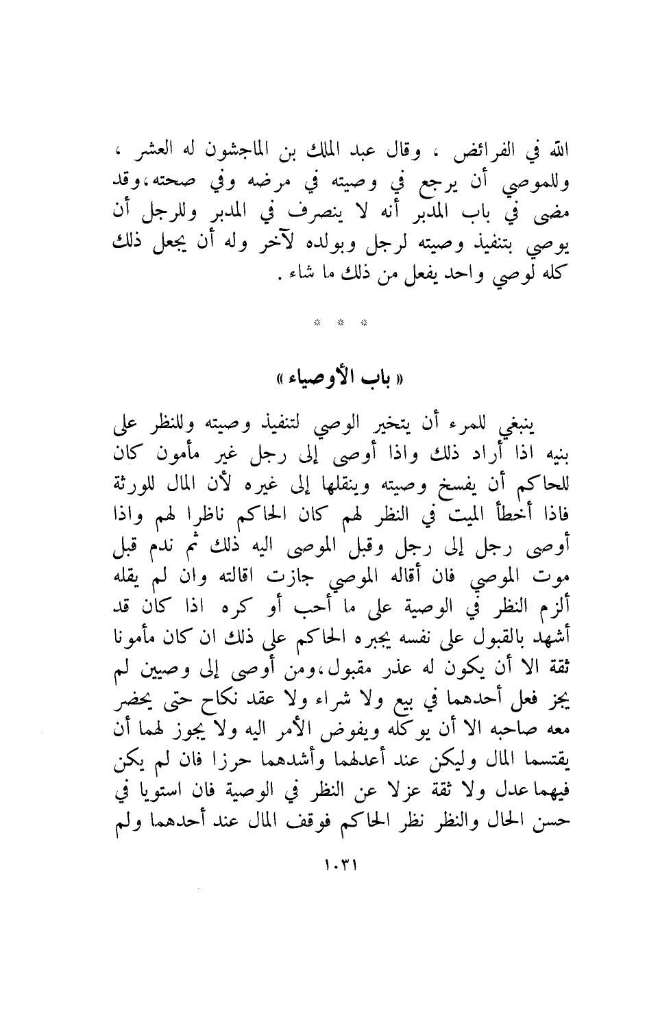 الله في الفرائض وقال عبد الملك بن الماحشون له العشر وللموصي أن يرجع في وصيته في مرضه وفي صحته وقد مضى في باب المدبر أنه لاينصرف في المدبر وللرجل أن يوصي بتنفيذ وصيته لرجل وبولده لآخر وله أن يجعل ذلك كله لوصي واحد يفعل من ذلك ما شاء