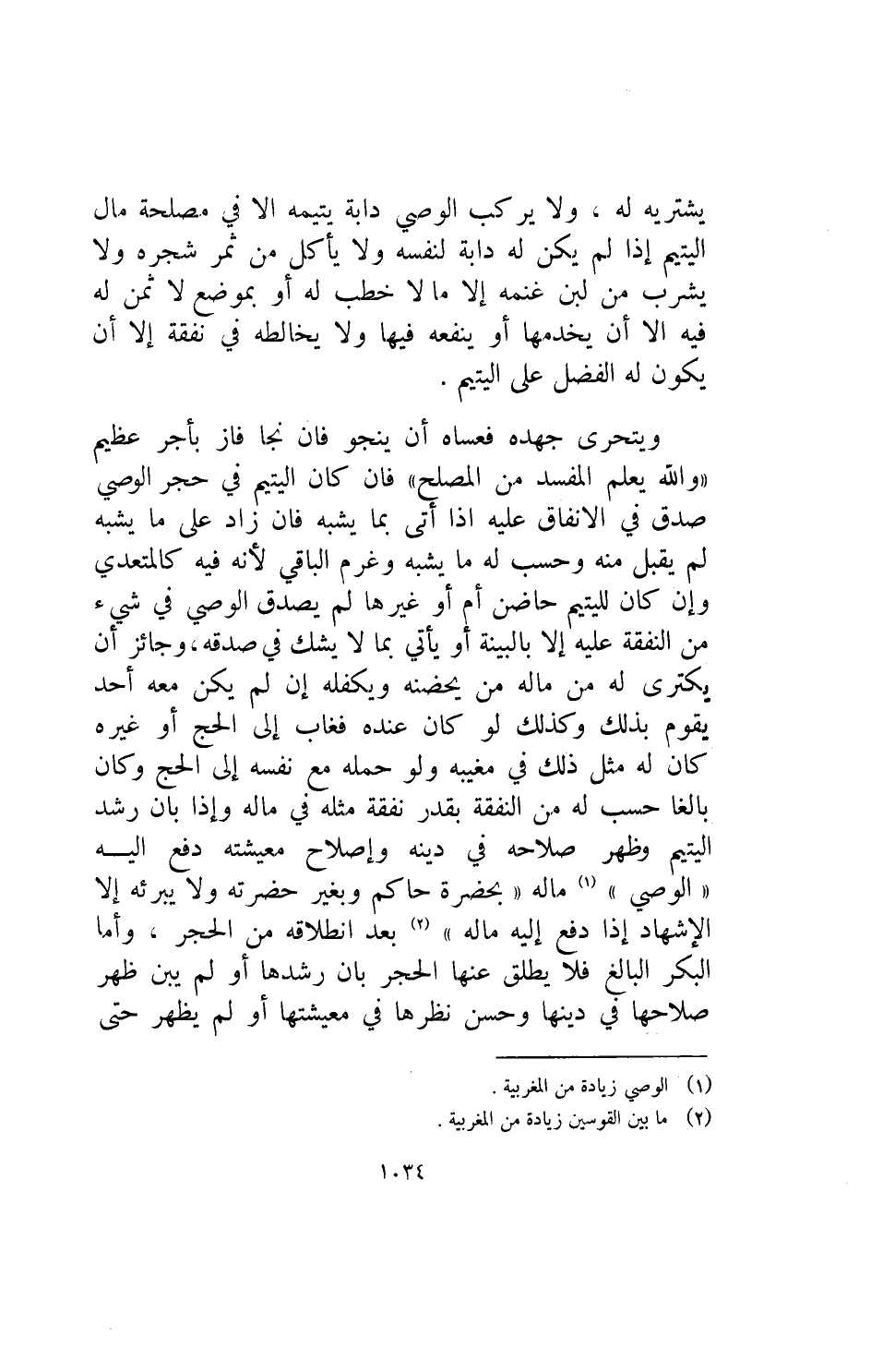 يشتريه له ولا يركب الوصي دابة يتيمه إلا في مصلحة مال اليتيم إذا لم يكن له دابة لنفسه ولا يأكل من ثمر شجره ولا يشرب من لبن غنمه إلا ما لا خطب له أو بموضع لا ثمن فيه إلا أن يخدمها أو ينفعه فيها ولا يخالطه في نفقة إلا أن يكون له الفضل على اليتيم ويتحرى جهده فعساه أن ينجو فإن نجا فاز بأجر عظيم والله يعلم المفسد من المصلح فإن كان اليتيم في حجر الوصي صدق في الانفاق عليه اذا أتى بما يشبه فإن زاد على ما يشبه لم يقبل منه وحسب له ما يشبه وغرم الباقي لأنه فيه كالمتعدي وإن كان لليتيم حاضن أم أو غيرها لم يصدق الوصي في شيء من النفقة عليه إلا بالبينة أو يأتي بما لا يشك في صدقه وجائز أن يكتري له من ماله من يحضنه ويكفله إن لم يكن معه أحد يقوم بذلك وكذلك لو كان عنده فغاب إلى الحج أو غيره كان له مثل ذلك في مغيبه ولو حمله مع نفسه إلى الحج وكان بالغا حسب له من النفقه بقدر نفقة مثله في ماله واذا بان رشد اليتيم وظهر صلاحه في دينه واصلاح معيشته دفع اليه الوصي ماله بحضرة حاكم وبغير حضرته ولا يبرئه الا الاشهاد اذا دفع اليه ماله بعد انطلاقه من الحجر واما البكر البالغ فلا يطلق عنها الحجر بان رشدها او لم يبن ظهر صلاحها في دينها وحسن نظرها في معيشتها او لم يظهر حتى