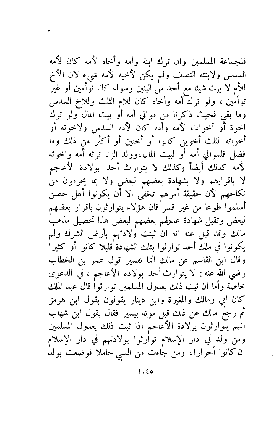فلجماعة المسلمين وان ترك ابنة وامه واخاه لأمه كان لأمه السدس ولابنته النصف ولم يكن لأخيه لأمه شيء لأن الأخ للأم لا يرث شيئا مع أحد من البنين وسواء كانا توأمين أو غير توأمين ولو ترك أمه وأخاه كان للام الثلث وللاخ السدس وما بقي فحيث ذكرنا من موالي أمه أو بيت المال ولو ترك أخوة أو أخوات لأمه وأمه كان لأمه السدس ولاخوته أو أخواته الثلث أخوين كانوا أو أختين أو أكثر من ذلك وما فضل فلموالي أمه أو لبيت المال وولد الزنا ترثه أمه واخوته لأمه كذلك أيضا وكذلك لا يتوارث أحد بولادة الأعاجم لا باقرارهم ولا بشهادة بعضهم لبعض ولا بما يحرمون من نكاحهم لأن حقيقة أمرهم تخفى إلا أن يكونوا أهل حصن أسلموا طوعا من غير قسر فإن هؤلاء يتوارثون باقرار بعضهم لبعض وتقبل شهادة عدولهم بعضهم لبعض هذا تحصيل مذهب مالك وقد قيل عنه انه ان ثبتت ولادتهم بأرض الشرك ولم يكونوا في ملك أحد توارثوا بتلك الشهادة قليلا كانوا أو كثيرا وقال ابن القاسم عن مالك إنما تفسير قول عمر بن الخطاب رضي الله عنه لا يتوارث أحد بولادة الأعاجم في الدعوى خاصة وأما ان ثبت ذلك بعدول المسلمين توارثوا قال عبد الملك كان ابي ومالك والمغيرة وابن دينار يقولون بقول ابن هرمز ثم رجع مالك عن ذلك قبل موته بيسير فقال بقول ابن شهاب انهم يتوارثون بولادة الأعاجم إذا ثبت ذلك بعدول المسلمين ومن ولد فى دار الإسلام توارثوا بولادتهم في دار الإسلام إن كانوا أحرارا ومن جاءت من السبي حاملا فوضعت بولد