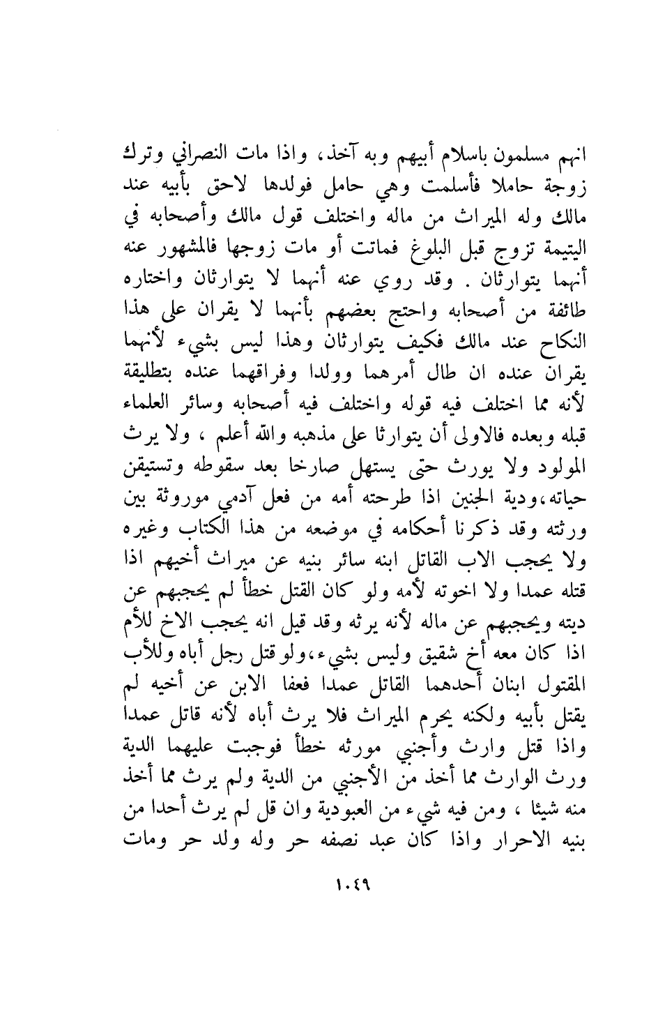 انهم مسلمون باسلام أبيهم وبه آخذ وإذا مات النصراني وترك زوجة حاملا فأسلمت وهي حامل فولدها لاحق بأبيه عند مالك وله الميراث من ماله واختلف قول مالك وله الميراث من ماله واختلف قول مالك وأصحابه في اليتيمة تزوج قبل البلوغ فماتت أو مات زوجها فالمشهور عنه أنهما يتوارثان وقد روي عنه أنهما لا يتوارثان واختاره طائفة من اصحابه واحتج بعضهم بانهما لا يقران على هذا النكاح عند مالك فكيف يتوارثان وهذا ليس بشيء لأنهما يقران عنده ان طال أمرهما وولدا وفراقهما عنده بتطليقه لأنه مما اختلف فيه قوله واختلف فيه أصحابه وسائر العلماء قبله وبعده فالأولى ان يتوارثا على مذهبه والله أعلم ولا يرث المولود ولا يورث حتى يستهل صارخا بعد سقوطه وتستقين حياته ودية الجنين إذا طرحته أمه من فعل آدمي موروثة بين ورثته وقد ذكرنا أحكامه في موضعه من هذا الكتاب وغيره ولا يحجب الاب القاتل ابنه سائر بنيه عن ميراث أخيهم إذا قتله عمدا ولا اخوته لأمه ولو كان القتل خطأ لم يحجبهم عن ديته ويحجبهم عن ماله لأنه يرثه وقد قيل انه يحجب الاخ للأم إذا كان معه أخ شقيق وليس بشيء ولو قتل رجل أباه وللأب المقتول ابنان أحدهما القاتل عمدا فعفا الابن عن أخيه لم يقتل بأبيه ولكنه يحرم الميراث فلا يرث أباه لأنه قاتل عمدا وإذا قتل وارث أجنبي مورثه خطأ فوجبت عليهما الدية ورث الوارث مما أخذ من الأجنبي من الدية ولم يرث مما أخذ منه شيئا ومن فيه شيء من العبودية وان قل لم يرث أحدا من بنيه الاحرار وإذا كان عبد نصفه حر وله ولد حر ومات