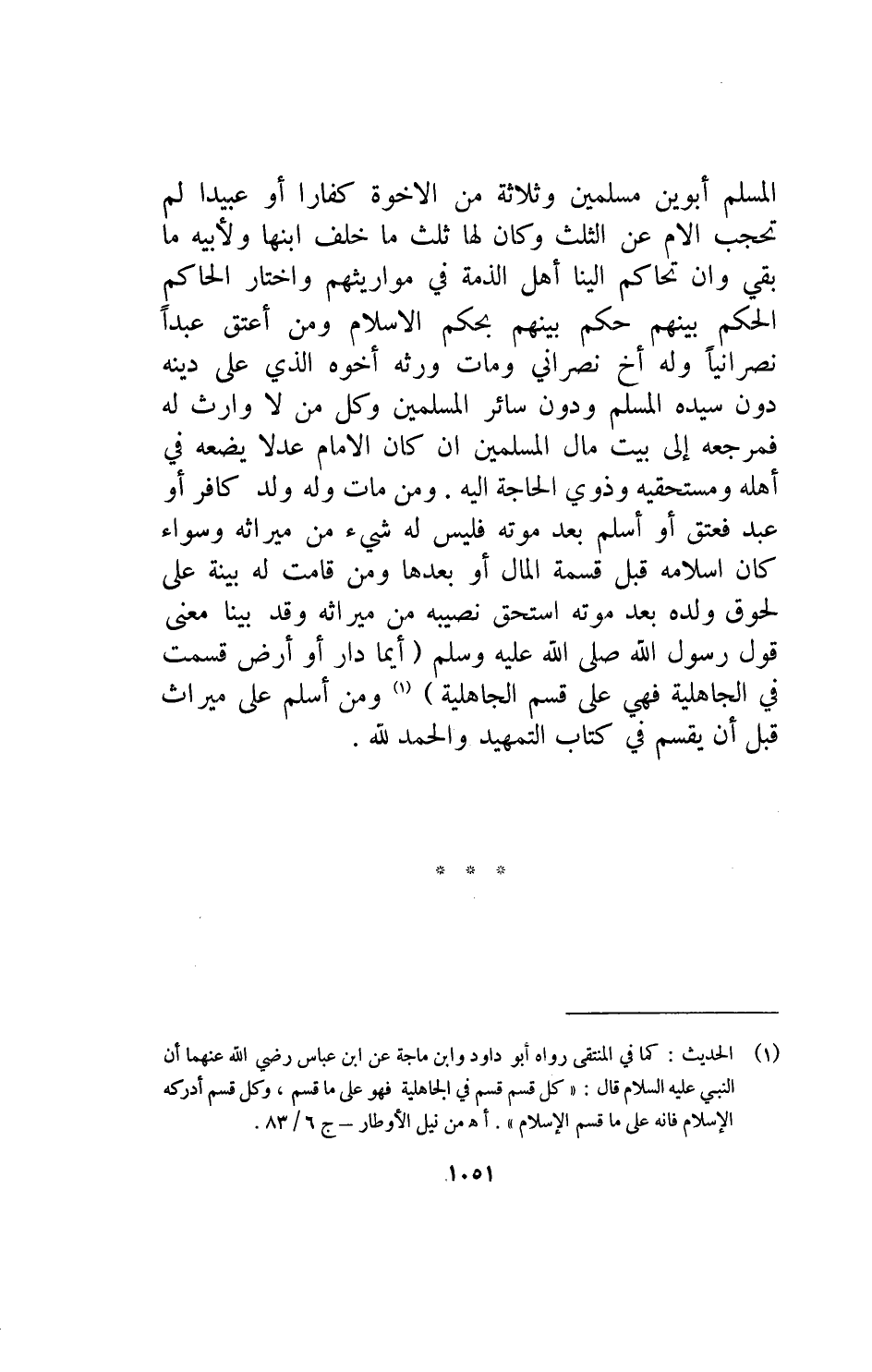 المسلم أبوين مسلمين وثلاثة من الاخوة كفارا أو عبيدا لم تحجب الام عن الثلث وكان لها ثلث ما خلف ابنها ولأبيه ما بقي وان تحاكم إلينا أهل الذمة في مواريثهم واختار الحاكم الحكم بينهم حكم بينهم بحكم الإسلام ومن أعتق عبدا نصرانيا وله أخ نصراني ومات ورثه أخوه الذي على دينه دون سيده المسلم ودون سائر المسلمين وكل من لا وارث له فمرجعه إلى بيت مال المسلمين إن كان الإمام عدلا يضعه في أهله ومستحقيه وذوي الحاجة إليه ومن مات وله ولد كافر أو عبد فعتق او أسلم بعد موته فليس له شيء من ميراثه وسواء كان اسلامه قبل قسمة المال أو بعدها ومن قامت له بينة على لحوق ولده بعد موته استحق نصيبه من ميراثه وقد بينا معنى قول رسول الله صلى الله عليه وسلم أيما دار أو أرض قسمت في الجاهلية فهي على قسم الجاهلية ومن أسلم على ميراث قبل أن يقسم في كتاب التمهيد والحمد لله