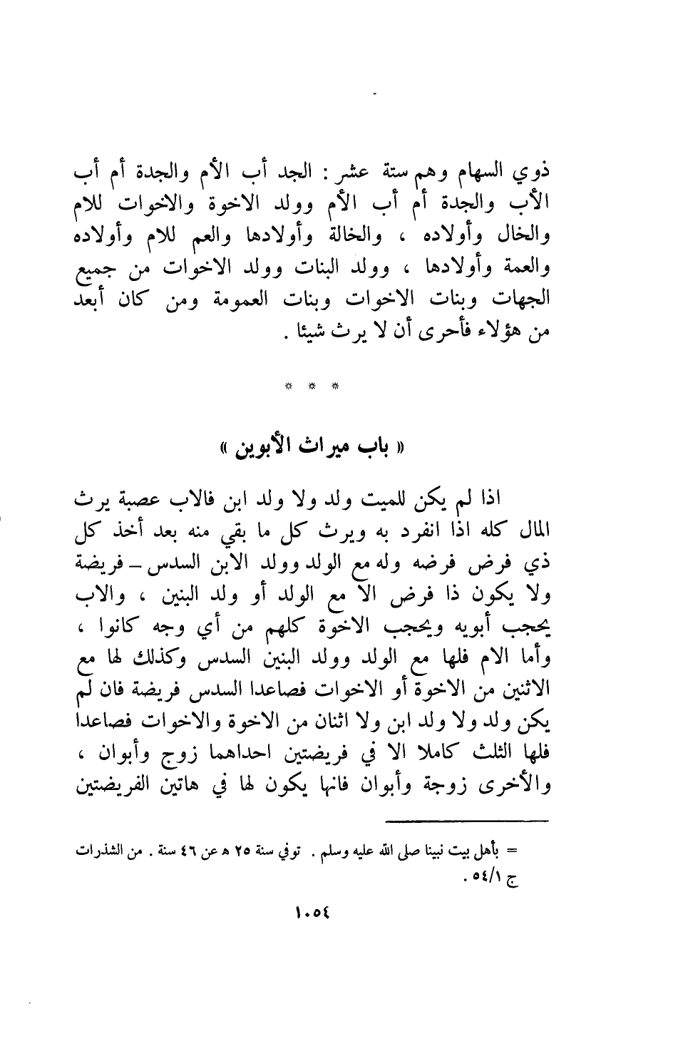 إذا لم يكن للميت ولد ولا ولد ابن فالأب عصبة يرث المال كله إذا انفرد به ويرث كل ما بقي منه بعد أخذ كل ذي فرض فرضه وله مع الولد وولد الابن السدس فريضة ولا يكون ذا فرض إلا مع الولد أو ولد البنين والأب يحجب أبويه ويحجب الاخوة كلهم من أي وجه كانوا وأما الأم فلها مع الولد وولد البنين السدس وكذلك لها مع الاثنين من الاخوة أو الأخوات فصاعدا السدس فريضة فإن لم يكن ولد ولا ولد ابن ولا اثنان من الاخوة والأخوات فصاعدا فلها الثلث كاملا إلا في فريضتين احداهما زوج وأبوان والأخرى زوجة وأبوان فانها يكون لها في هاتين الفريضتين