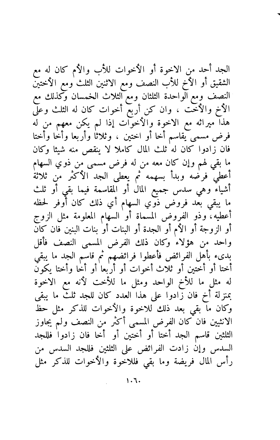 الجد أحد من الأخوة أو الأخوات للأب والأم كان له مع الشقيق أو الأخ للأب النصف ومع الاثنين الثلث ومع الأختين النصف ومع الواحدة الثلثان ومع الثلاث الخمسان وكذلك مع الأخ والأخت وإن كن أربع أخوات كان له الثلث وعلى هذا ميراثه مع الأخوة والأخوات إذا لم يكن معهم من له فرض مسمى يقاسم أخا أو أختين وثلاثا وأربعا وأخا وأختا فإن زادوا كان له ثلث المال كاملا لا ينقص منه شيئا وكان ما بقي لهم وإن كان معه من له فرض مسمى من ذوي السهام أعطي فرضه وبدأ بسهمه ثم يعطى الجد الأكثر من ثلاثة أشياء وهي سدس جميع المال أو المقاسمة فيما بقي أو ثلث ما يبقى بعد فروض ذوي السهام أي ذلك كان أوفر لحظه أعطيه وذو الفروض المسماة أو السهام المعلومة مثل الزوج أو الزوجة أو الأم أو الجدة أو البنات أو بنات البنين فإن كان واحد من هؤلاء وكان ذلك الفرض المسمى النصف فأقل بدىء بأهل الفرائض فأعطوا فرائضهم ثم قاسم الجد ما يبقى أختا أو أختين أو ثلاث أخوات أو أربعا أو أخا وأختا يكون له مثل ما للأخ الواحد ومثل ما للأخت لأنه مع الاخوة بمنزلة أخ فإن زادوا على هذا العدد كان للجد ثلث ما يبقى وكان ما بقي بعد ذلك للإخوة والأخوات للذكر مثل حظ الانثيين فإن كان الفرض المسمى أكثر من النصف ولم يجاوز الثلثين قاسم الجد أختا أو أختين أو أخا فإن زادوا فللجد السدس وإن زادت الفرائض على الثلثين فللجد السدس من رأس المال فريضة وما بقي فللأخوة والأخوات للذكر مثل