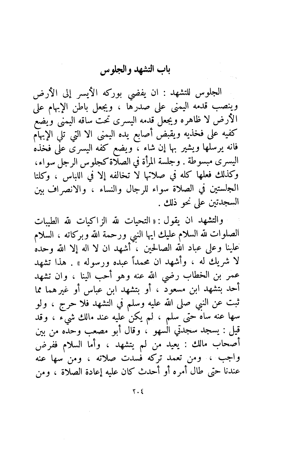 الجلوس للتشهد: أن يفضي بوركه الأيسر إلى الأرض وينصب قدمه اليمنى على صدرها ويجعل باطن الإبهام على الأرض لا ظاهره ويجعل قدمه اليسرى تحت ساقه اليمنى ويضع كفيه على فخذيه ويقبض أصابع يده اليمنى إلا التي تلي الإبهام فإنه يرسلها ويشير بها إن شاء ويضع كفه اليسرى على فخذه اليسرى مبسوطة وجلسة المرأة في الصلاة كجلوس الرجل سواء وكذلك فعلها كله في صلاتها لا تخالفه إلا في اللباس وكلتا الجلستين في الصلاة سواء للرجال والنساء والانصراف بين السجدتين على نحو ذلك.