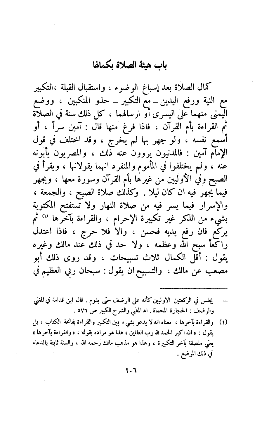 كمال الصلاة بعد إسباغ الوضوء واستقبال القبلة التكبير مع النية ورفع اليدين - مع التكبير - حذو المنكبين ووضع اليمنى منهما على اليسرى أو إرسالهما كل ذلك سنة في الصلاة ثم القراءة بأم القرآن فإذا فرغ منها قال: آمين سرا أو أسمع نفسه ولو جهر بها لم يخرج.