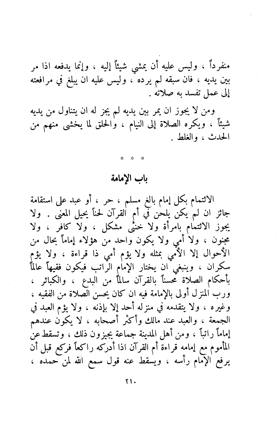 ولا يجوز الائتمام بامرأة ولا خنثى مشكل ولا كافر ولا مجنون ولا أمي ولا يكون واحد من هؤلاء إماما بحال من الأحوال إلا الأمي بمثله ولا يؤم أمي ذا قراءة ولا يؤم سكران سكران.
