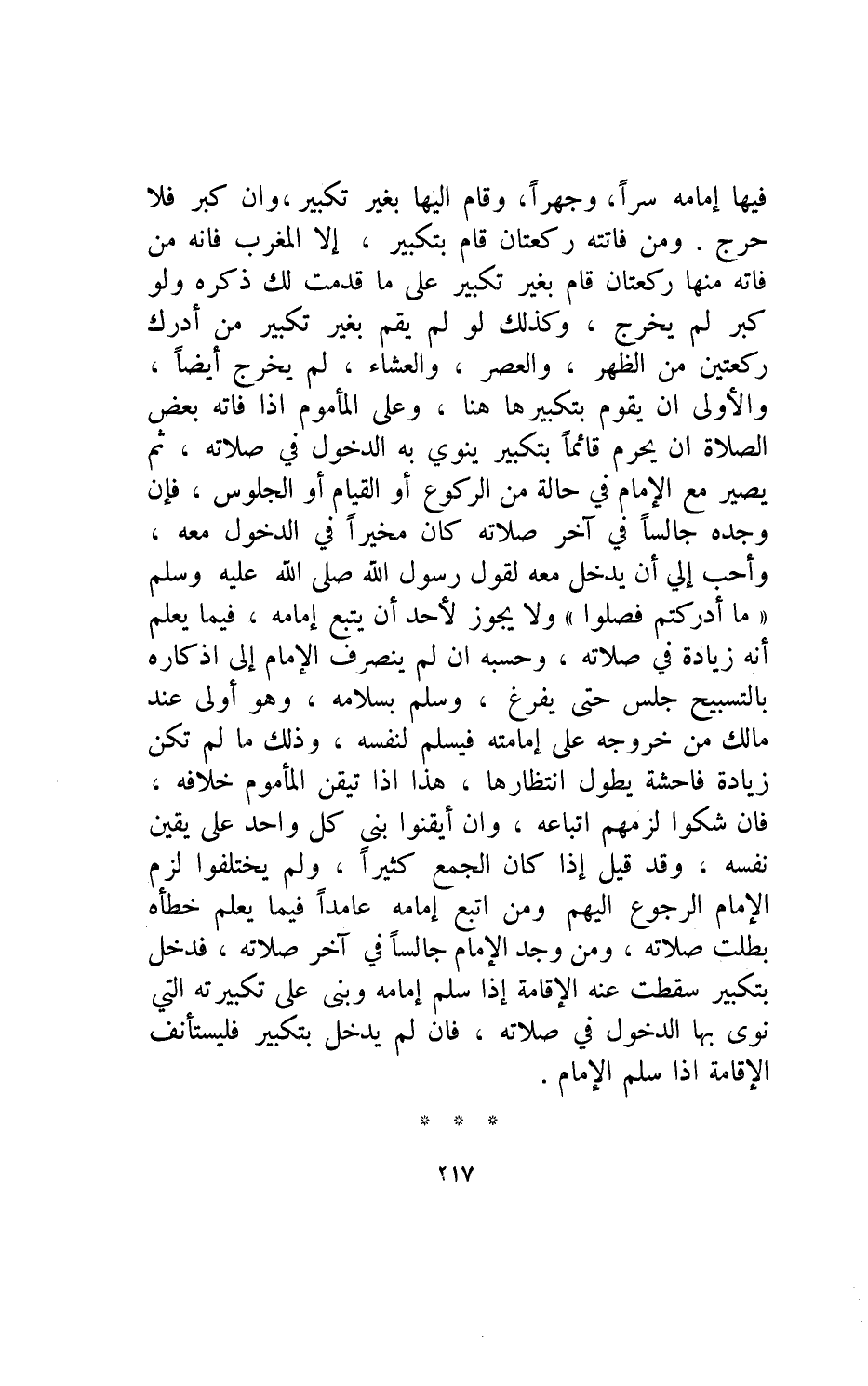 فيها إمامه سرا وجهرا وقام إليها بغير تكبير وإن كبر فلا حرج ومن فاتته ركعتان قام بتكبير إلا المغرب فإنه من فاته منها ركعتان قام بغير تكبير على ما قدمت لك ذكره ولو كبر لم يخرج وكذلك لو لم يقم بغير تكبير من أدرك ركعتين من الظهر والعصر والعشاء لم يخرج أيضا والأولى أن يقوم بتكبيرها هنا وعلى المأموم إذا فاته بعض الصلاة أن يحرم قائما بتكبير ينوي به الدخول في صلاته ثم يصير مع الإمام في حاله من الركوع أو القيام أو الجلوس فإن وجده جالسا في آخر صلاته كان مخيرا في الدخول معه وأحب إلي أن يدخل معه لقول رسول الله صلى الله عليه وسلم: "ما أدركتم فصلوا" ولا يجوز لأحد أن يتبع إمامه فيما يعلم أنه زيادة في صلاته وحسبه إن لم ينصرف الإمام إلى إذكاره بالتسبيح جلس حتى يفرغ وسلم بسلامه وهو أولى عند مالك من خروجه على إمامته فيسلم لنفسه وذلك مالم تكن زيادة فاحشة يطول انتظارها هذا إذا تيقن المأموم خلافه فأن شكوا لزمهم اتباعه وان أيقنوا بنى كل واحد على يقين الماموم خلافه فإن شكول لزمهم اتباعه وان أيقنوا بنى كل واحد على يقين نفسه.