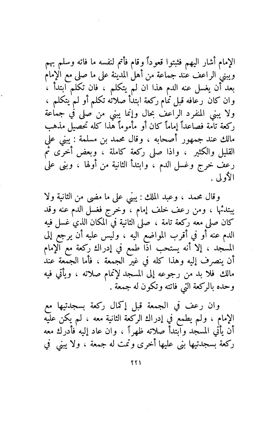 الإمام أشار إليهم فثبتوا قعودا وقام فأتم لنفسه ما فاته وسلم بهم ويبنى الراعف عند جماعة من أهل المدينة على ما صلى مع الإمام بعد أن يغسل عنه الدم هذا إن لم يتكلم فإن تكلم ابتدأ وإن كان رعافه قبل تمام ركعة ابتدأ صلاته تكلم أو لم يتكلم ولا يبني المنفرد الراعف بحال وإنما يبنى من صلى في جماعة ركعة تامة فصاعدا إماما كان أو مأموما هذا كله تحصيل مذهب مالك عند جمهور أصحابه وقال محمد بن مسلمة يبني على القليل والكثير وإذا صلى ركعة كاملة وبعض أخرى ثم رعف خرج وغسل الدم وابتدأ الثانية من أولها وبنى على الأولى.