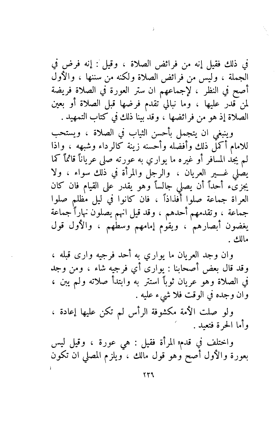 والاول أصح في النظر لإجماعهم أن ستر العورة في الصلاة فريضة لمن قدر عليها ومن نبالي تقدم فرضها قبل الصلاة أو بعين الصلاة إذ هو من فرائضها وقد بينا ذلك في كاب التمهيد.
