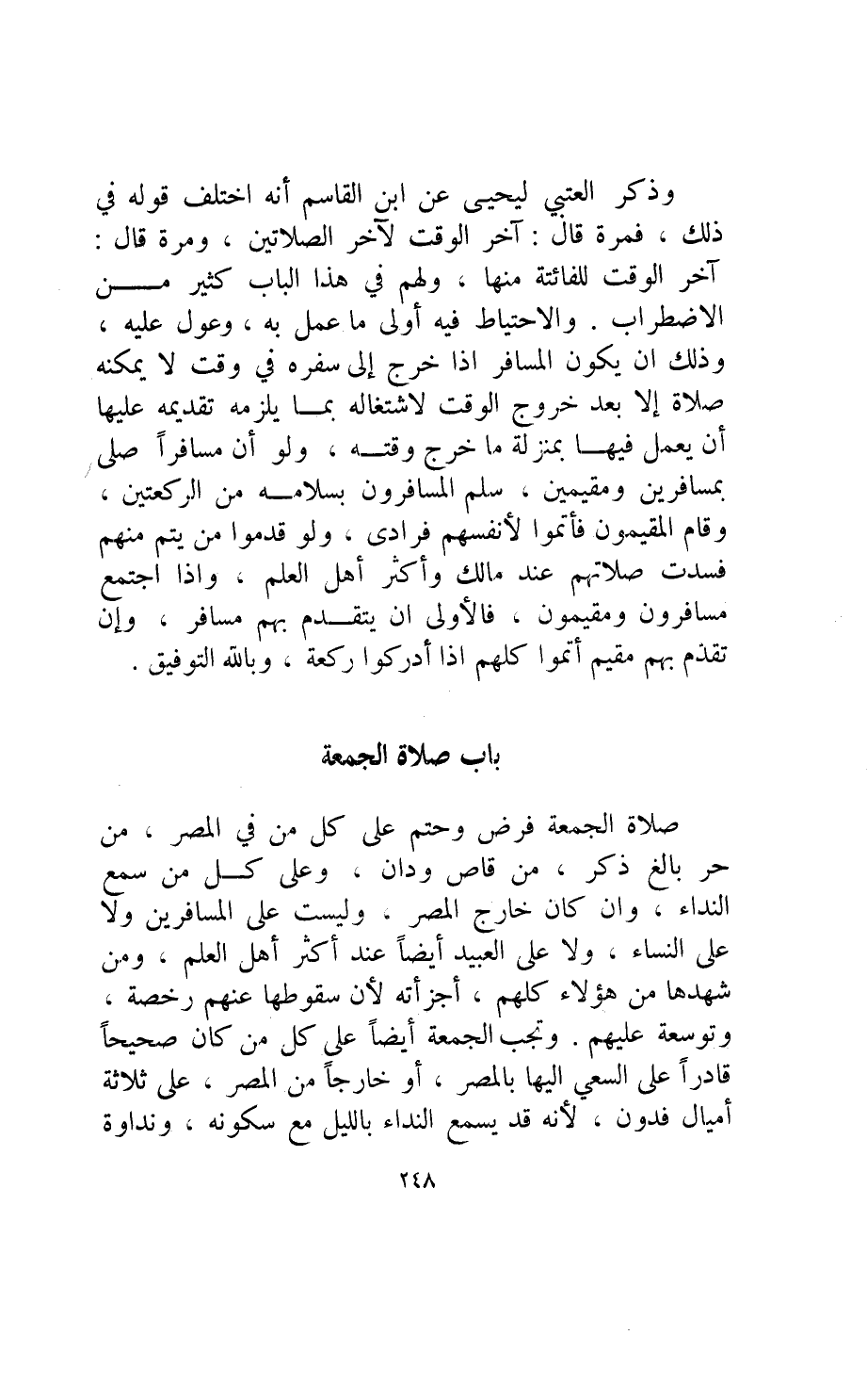 صلاة الجمعة فرض وحتم على كل من في المصر من حر بالغ ذكر من قاص ودان وعلى كل من سمع النداء وإن كان خارج المصر وليست على المسافرين ولا على النساء ولا على العبيد أيضا عند أكثر أهل العلم ومن شهدها من هؤلاء كلهم أجزأته لأن سقوطها عنهم رخصة وتوسعة عليهم.