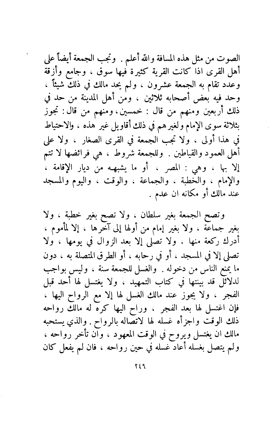وتجب الجمعة أيضا على أهل القرى إذا كانت القرية كثيرة فيها سوق وجامع وأزقة وعدد تقام به الجمعة عشرون ولم يحد مالك في ذلك شيئا وحد فيه بعض أصحابه ثلاثين ومن أهل المدينة من حد في ذلك أربعين ومنهم من قال: خمسين ومنهم من قال: تجوز بثلاثة سوى الإمام ولغيرهم في ذلك أقاويل غير هذه والاحتياط في هذا أولى.