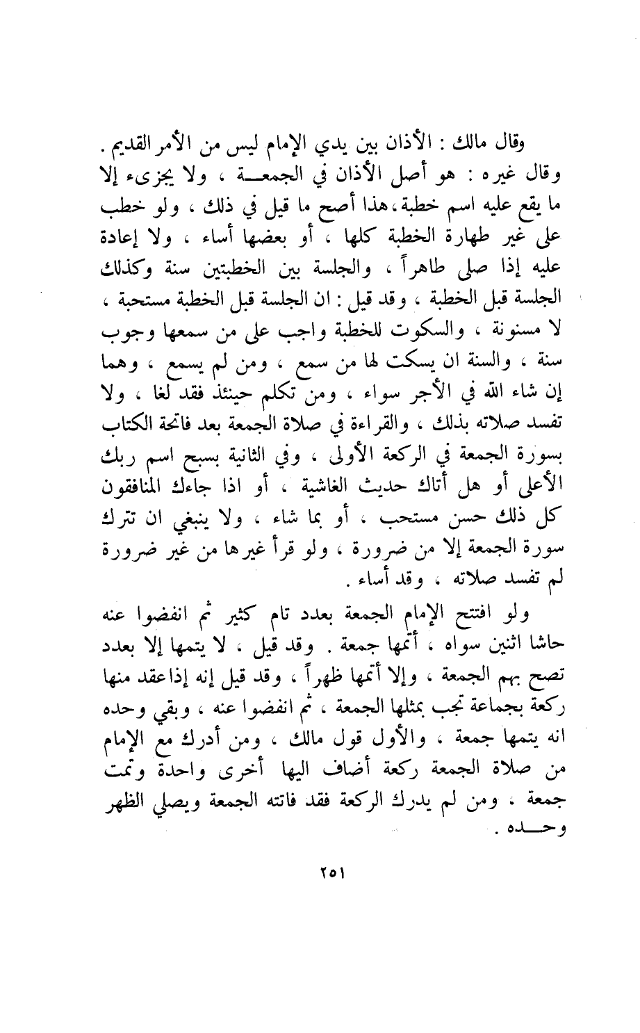 وقد قيل: إنه إذا عقد منها ركعة بجماعة تجب بمثلها الجمعة ثم انفضوا عنه وبقي وحده أنه يتمها جمعة، والأول قول مالك ومن أدرك مع الإمام من صلاة الجمعة ركعة أضاف إليها أخرى واحدة وتمت جمعة ومن لم يدرك الركعة فقد فاتته الجمعة ويصلي الظهر وحده.