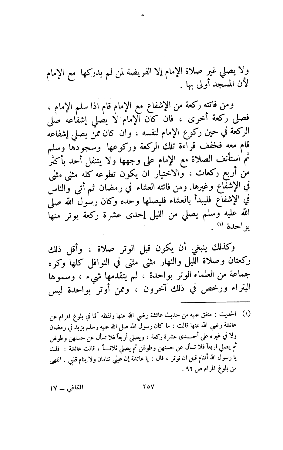 ومن فاتته ركعة من الإشفاع مع الإمام قام إذا سلم الإمام فصلى ركعة أخرى فإن كان الإمام لا يصلي إشفاعه صلى الركعة في حين ركوع الإمام لنفسه وإن كان ممن يصلي إشفاعه قام معه فخفف قراءة تلك الركعة وركوعها وسجودها وسلم ثم استأنف الصلاة مع الإمام على وجهها ولا يتنفل أحد بأكثر من أربع ركعات والاختيار أن يكون تطوعه كله مثنى مثنى في الإشفاع وغيرها ومن فاتته العشاء في رمضان ثم أتى والناس في الإشفاع فليبدأ بالعشاء فليصلها وحده وكان رسول الله صلى الله عليه وسلم يصلي من الليل إحدى عشرة ركعة يوتر منها بواحدة.