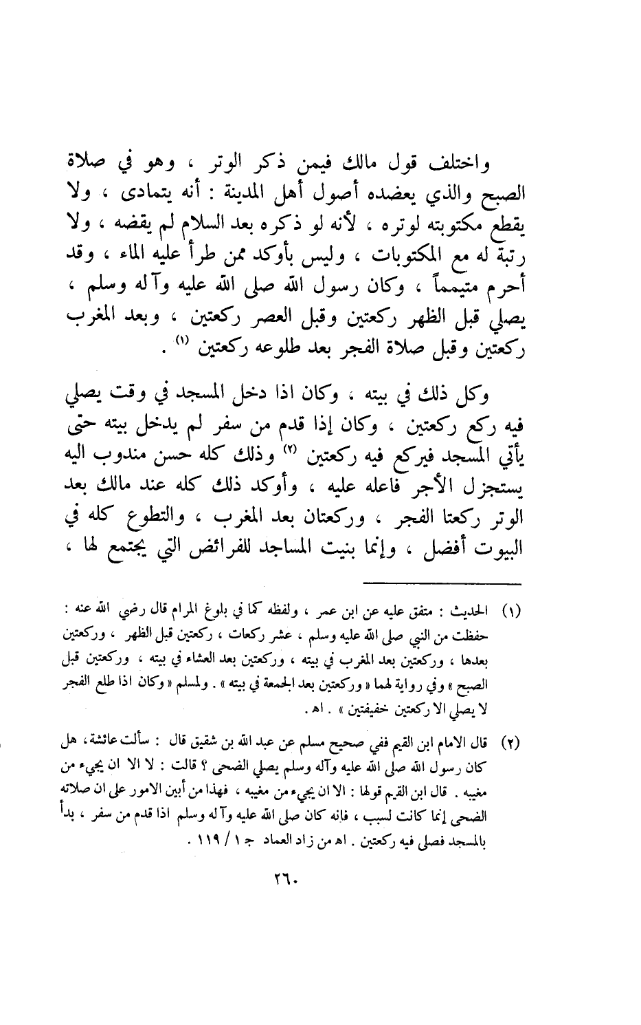 واختلف قول مالك فيمن ذكر الوتر وهو في صلاة الصبح والذي يعضده أصول أهل المدينة: انه يتمادى ولا يقطع مكتوبته لوتره لأنه لو ذكره بعد السلام لم يقضه ولا رتبه له مع المكتوبات وليس بأوكد ممن طرأ عليه الماء وقد أحرم متيمما وكان رسول الله صلى الله عليه وآله وسلم يصلي قبل الظهر ركعتين وقبل العصر ركعتين وبعد المغرب ركعتين وقبل صلاة الفجر بعد طلوعه ركعتين.