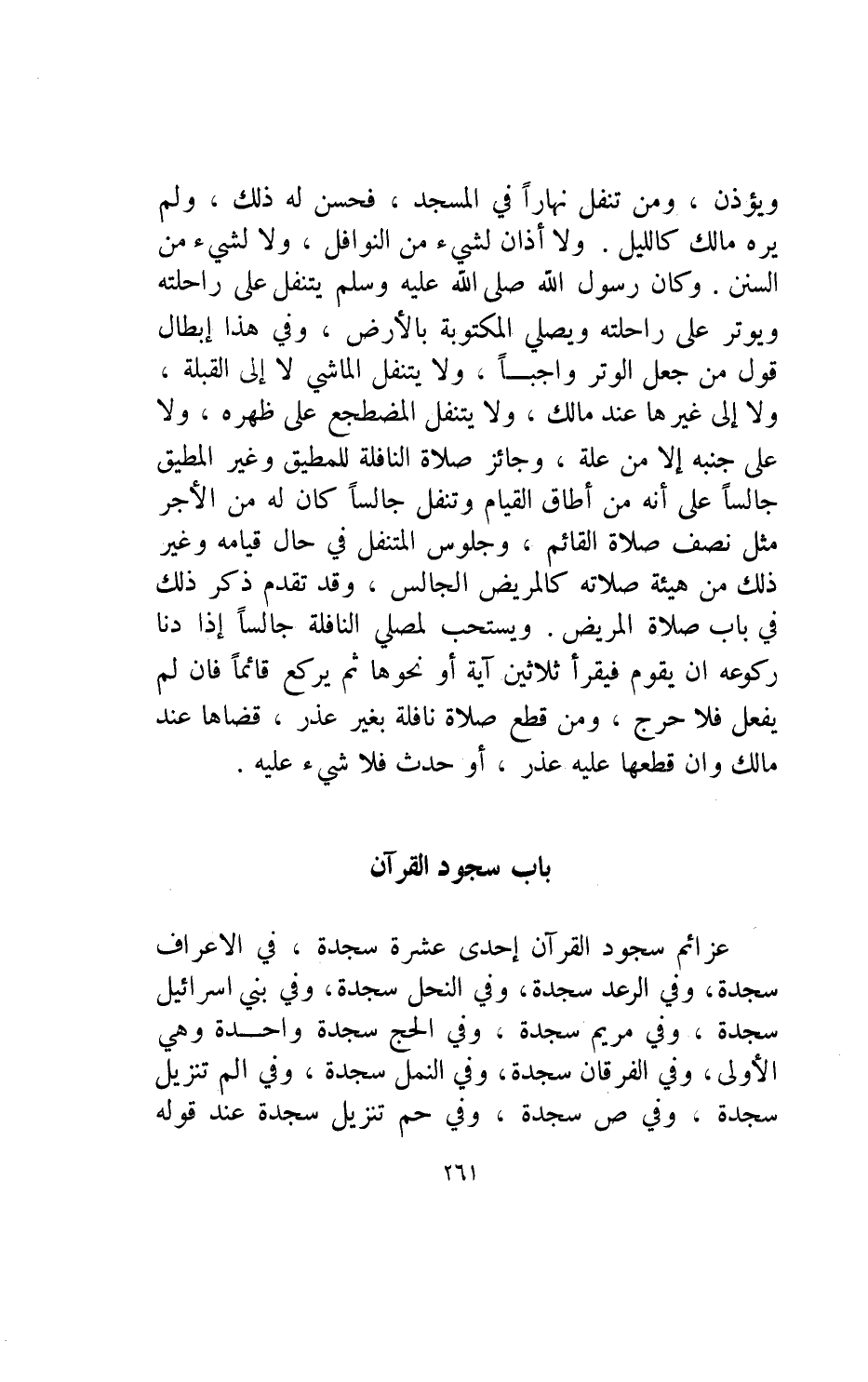 ويستحب لمصلي النافلة جالسا إذا دنا ركوعه أن يقوم فيقرأ ثلاثين آية أو نحوها ثم يركع قائما فإن لم يفعل فلا حرج ومن قطع صلاة نافلة بغير عذر قضاها عند مالك وإن قطعها عليه عذر أو حدث فلا شيء عليه