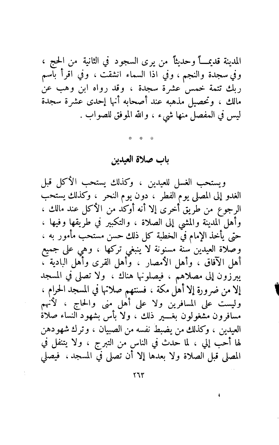 وصلاة العيدين سنة مسنونة لا ينبغي تركها وهي على جميع أهل الآفاق وأهل الأمصار وأهل القرى وأهل البادية يبرزون إلى مصلاهم فيصلونها هناك ولا تصلى في المسجد إلا من ضرورة إلا أهل مكة فسنتهم صلاتها في المسجد الحرام وليست على المسافرين ولا على أهل منى والحاج لأنهم مسافرون مشغولون بغير ذلك ولا بأس بشهود النساء صلاة العيدين وكذلك من يضبط نفسه من الصبيان وترك شهودهن لها أحب إلي لما حدث في الناس من التبرج ولا يتنفل في المصلى قبل الصلاة ولا بعدها إلا أن تصلى في المسجد فيصلي