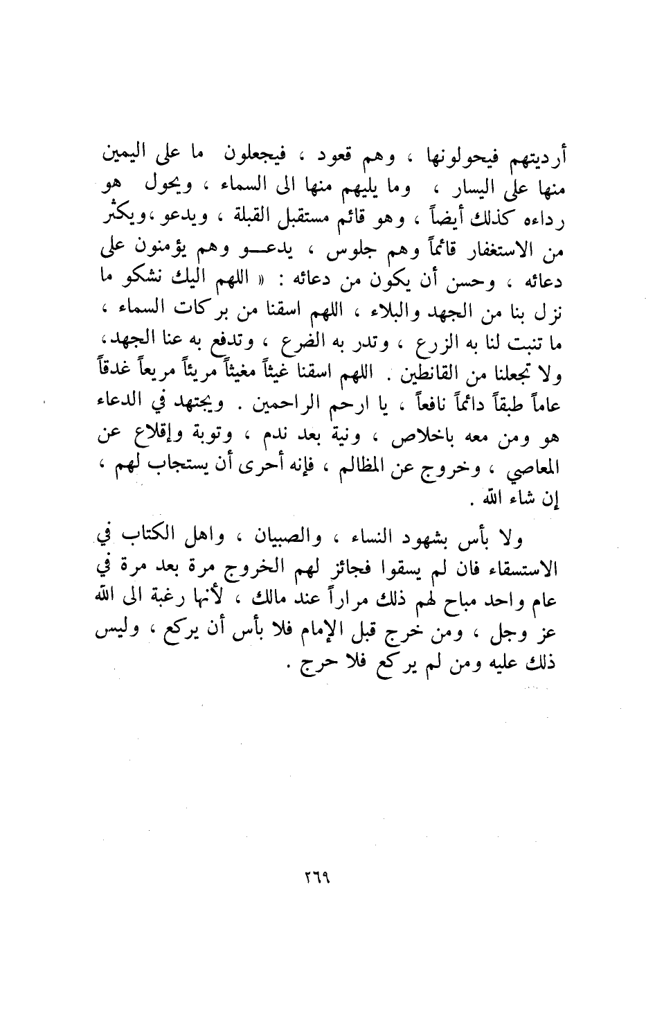 أرديتهم فيحولونها وهو قعود فيجعلون ما على اليمين منها على اليسار وما يليهم منها الى السماء ويحول هو رداءه تأسيا برسول الله صلى الله عليه وآله وسلم في ذلك ورجاء تحويل حالهم إلى ما يرجونه وأمرهم بتحويل أرديتهم فيحولونها وهم قعود فيجعلون ما على اليمين منها على اليسار وما يليهم منها إلى السماء ويحول هو رداءه كذلك أيضا وهو قائم مستقبل القبلة ويدعو ويكثر من الاستغفار قائما وهم جلوس يدعو وهم يؤمنون على دعائه وحسن أن يكون من دعائه: "اللهم إليك نشكو ما نزل بنا من الجهد والبلاء اللهم اسقنا من بركات السماء ما تنبت لنا به الزرع وتدر به الضرع وتدفع به عنا الجهد ولا تجعلنا من القانطين اللهم اسقنا غيثا مغيثا مريئا مريعا غدقا عاما طبقا دائما نافعا يا أرحم الراحمين" ويجتهد في الدعاء هو ومن معه بإخلاص ونية بعد ندم وتوبة وإقلاع عن المعاصي وخروج عن المظالم فإنه أحرى أن يستجاب لهم إن شاء الله.