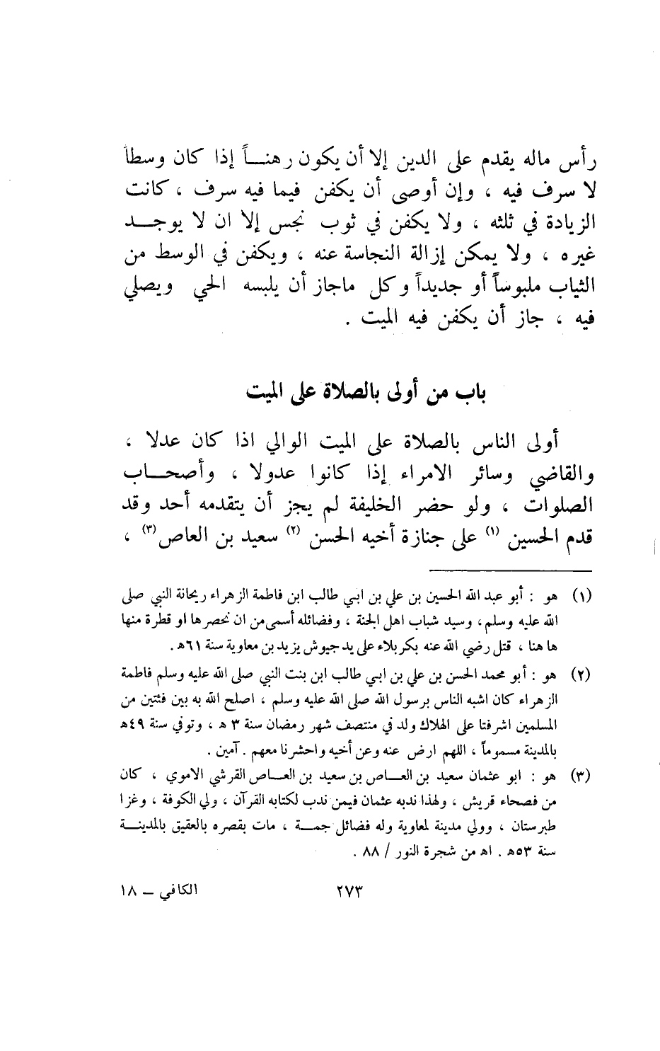 رأس ماله يقدم على الدين إلا أن يكون رهنا إذا كان وسطا لا سرف فيه وإن أوصى أن يكفن فيما فيه سرف كانت الزيادة في ثلثه ولا يكفن في ثوب نجس إلا أن لا يوجد غيره ولا يمكن إزالة النجاسة عنه ويكفن في الوسط من الثياب ملبوسا أو جديدا وكل ما جاز أن يلبسه الحي ويصلي فيه جاز أن يكفن فيه الميت