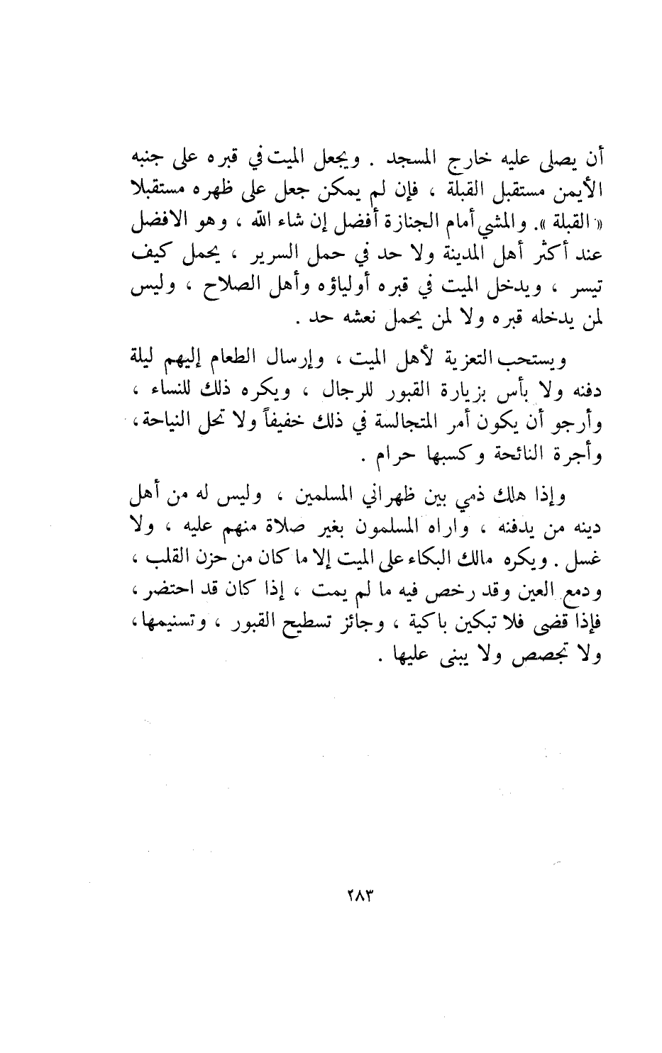 ويكره مالك البكاء على الميت إلا ما كان من حزن القلب ودمع العين وقد رخص فيه ما لم يمت إذا كان قد احتضر فإذا قضى فلا تبكين باكية وجائز تسطيح القبور وتسنيمها ولا تجصص ولا يبنى عليها.