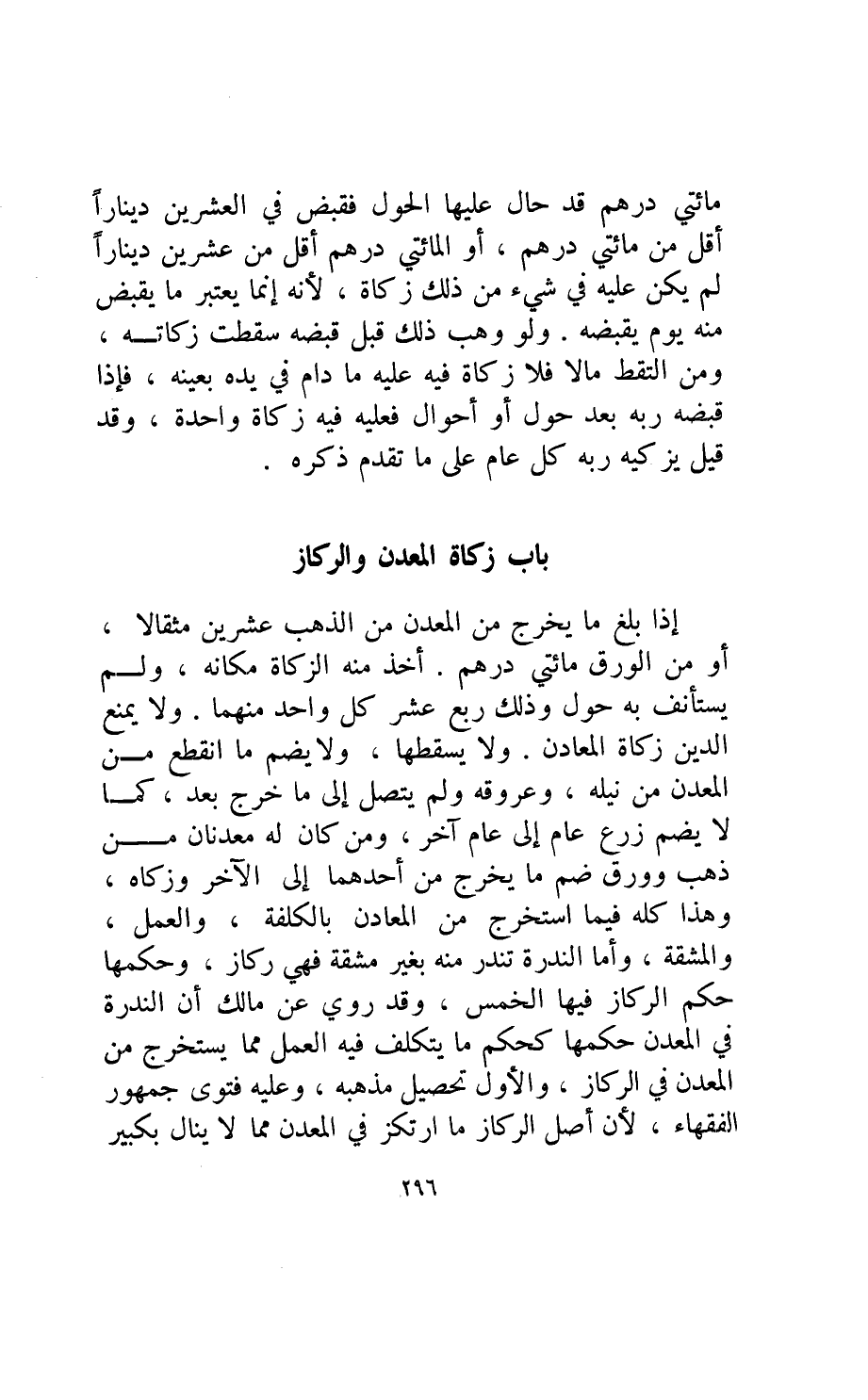 أخذ منه الزكاة مكانه ولم يستأنف به حول وذلك ربع عشر. كل واحد منهما. ولا يمنع الدين زكاة المعادن. ولا يسقطها ولا يضم ما انقطع من المعدن من نيله وعروقه ولم يتصل الى ما خرج بعد كما لا يضم زرع عام الى عام آخر ومن كان له معدنان من ذهب وورق ضم ما يخرج من أحدهما الى الآخر وزكاه وهذا كله فيما استخرج من المعادن بالكلفة والعمل والمشقة وأما الندرة منه بغير مشقة فهي ركاز وحكمها حكم الركاز فيها الخمس وقد روي عن مالك أن الندرة في المعدن حكمها كحكم ما يتكلف فيه العمل مما يستخرج من المعدن في الركاز والأول تحصيل مذهبه وعليه فتوى جمهور الفقهاء لأن أصل الركاز ما ارتكز في المعدن مما لا ينال بكبير