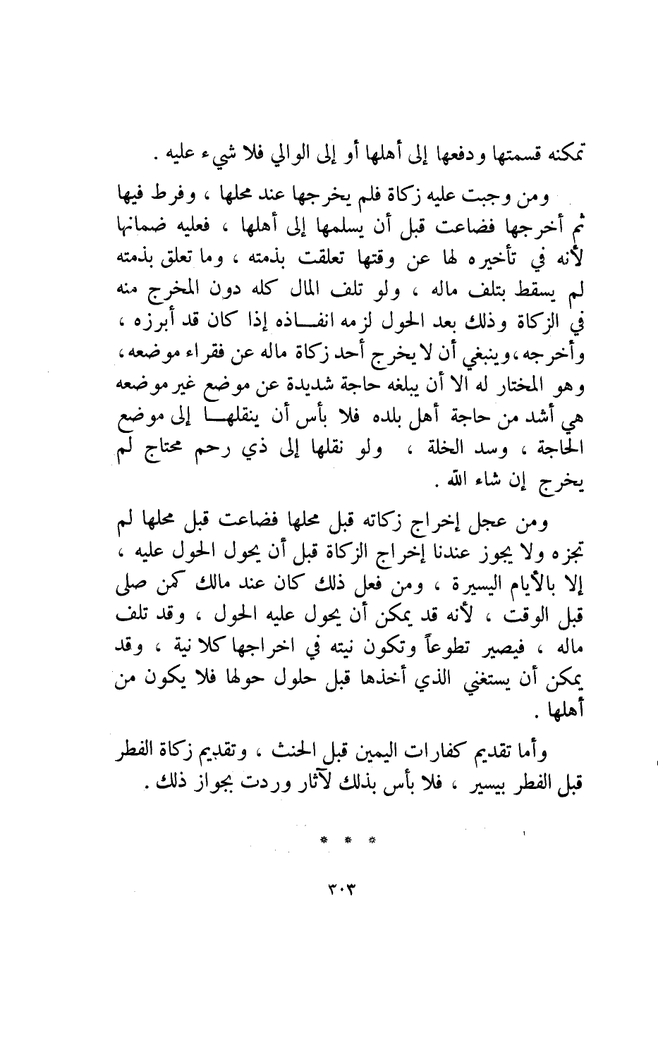 ومن عجل إخراج زكاته قبل محلها فضاعت قبل محلها لم تجزه ولا يجوز عندنا إخراج الزكاة قبل أن يحول الحول عليه إلا بالأيام اليسيرة ومن فعل ذلك كان عند مالك كمن صلى قبل الوقت لأنه قد يمكن أن يحول عليه الحول وقد تلف ماله فيصير تطوعا وتكون نيته في إخراجها كلانية وقد يمكن أن يستغني الذي أخذها قبل حلول حولها فلا يكون من أهلها.