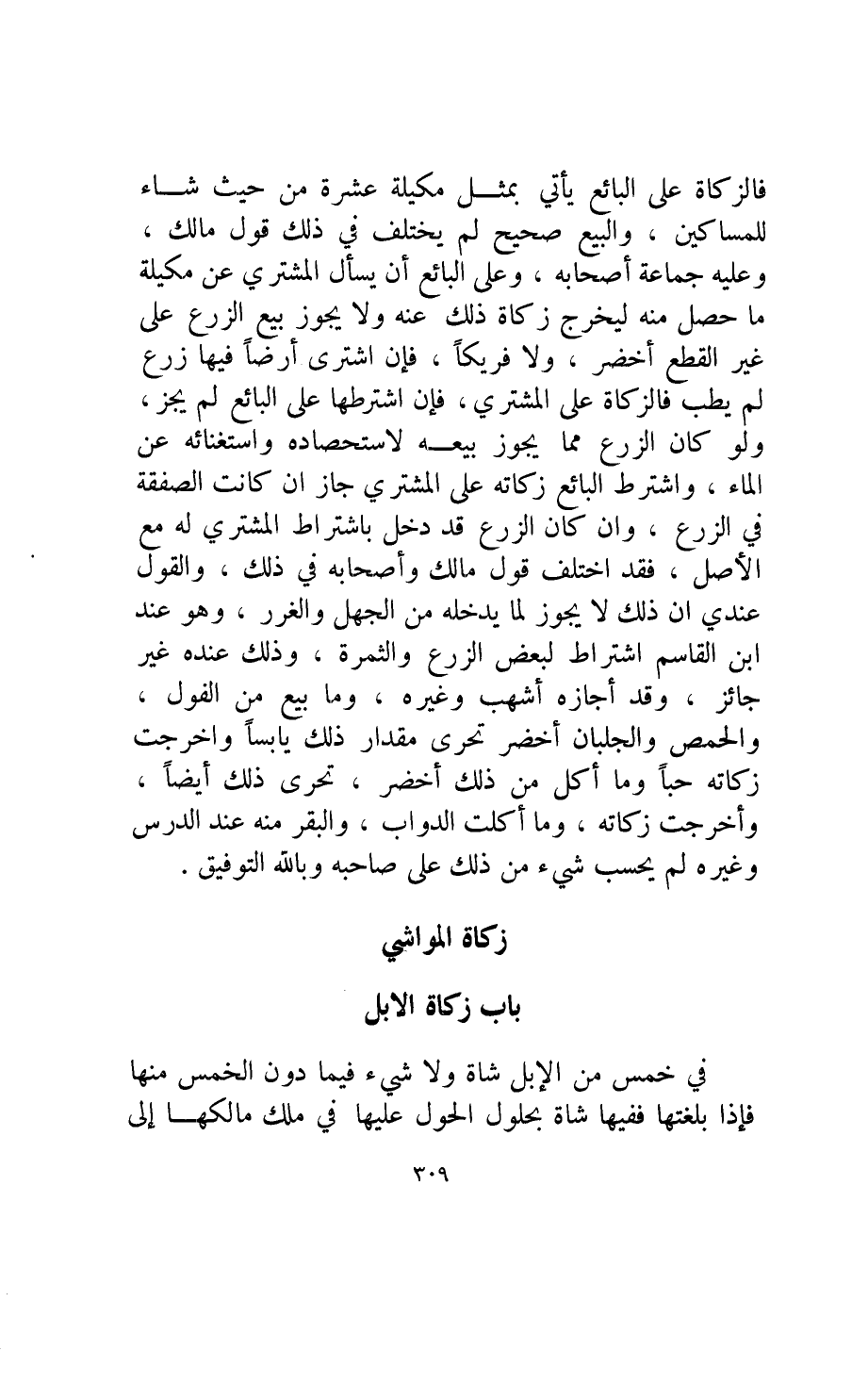 فالزكاة على البائع يأتي بمثل مكيلة عشره من حيث شاء للمساكين والبيع صحيح لم يختلف في ذلك قول مالك وعليه جماعة أصحابه وعل البائع أن يسأل المشتري عن مكيلة ما حصل منه ليخرج زكاة ذلك عنه ولا يجوز بيع الزرع على غير القطع اخضر ولا فريكا فإن اشترى أرضا فيها زرع لم يطب فالزكاة على المشتري فإن اشترطها على البائع لم يجز ولو كان الزرع مما يجوز بيعه لا ستحصاده واستغنائه عن الماء واشترط البائع زكاته على المشتري جاز إن كانت الصفقة في الزرع وإن كان الزرع قد دخل باشراط المشترى له مع الأصل فقد اختلف قول مالك وأصحابه في ذلك والقول عندي أن ذلك لا يجوز لما يدخله من الجهل والغرر وهو عند ابن القاسم اشتراط لبعض الزرع والثمرة وذلك عنده غير جائز وقد أجازه أشهب وغيره وما بيع من الفول والحمص والجلبان أخضر تحرى مقدار ذلك يابسا وأخرجت زكاته حبا وما أكل من ذلك أخضر تحرى ذلك أيضا أيضا وأخرجت زكاته وما أكلت الدواب والبقر منه عند الدرس وغيره لم يحسب شيء من ذلك على صاحبه وبالله التوفيق