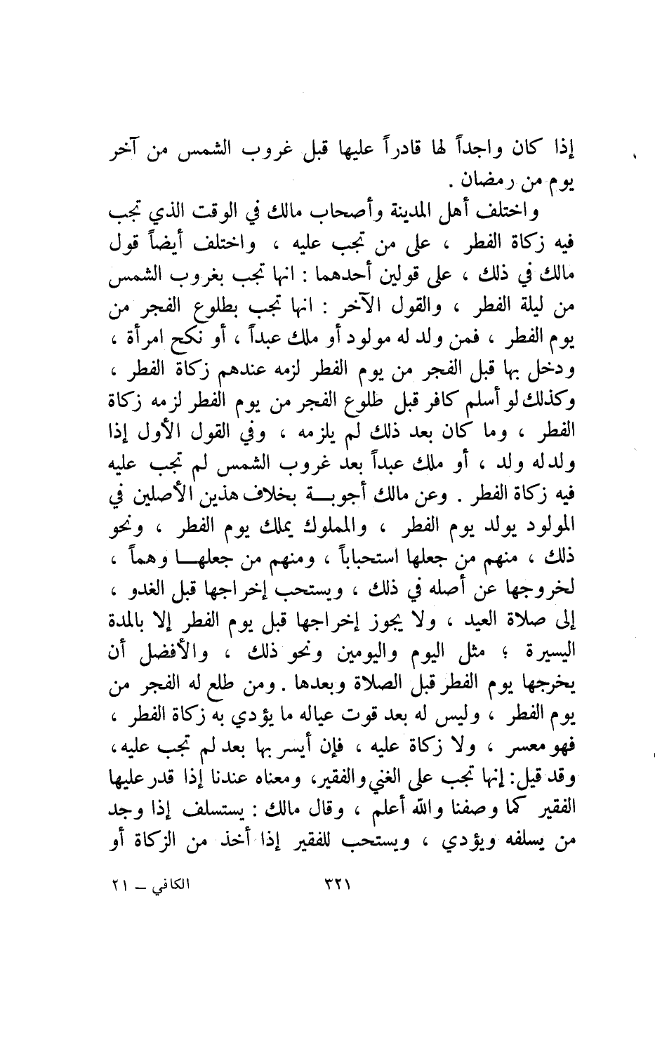 واختلف أهل المدينة وأصحاب مالك في الوقت الذي تجب فيه زكاة الفطر، على من تجب عليه، واختلف أيضا قول مالك في ذلك على قولين: