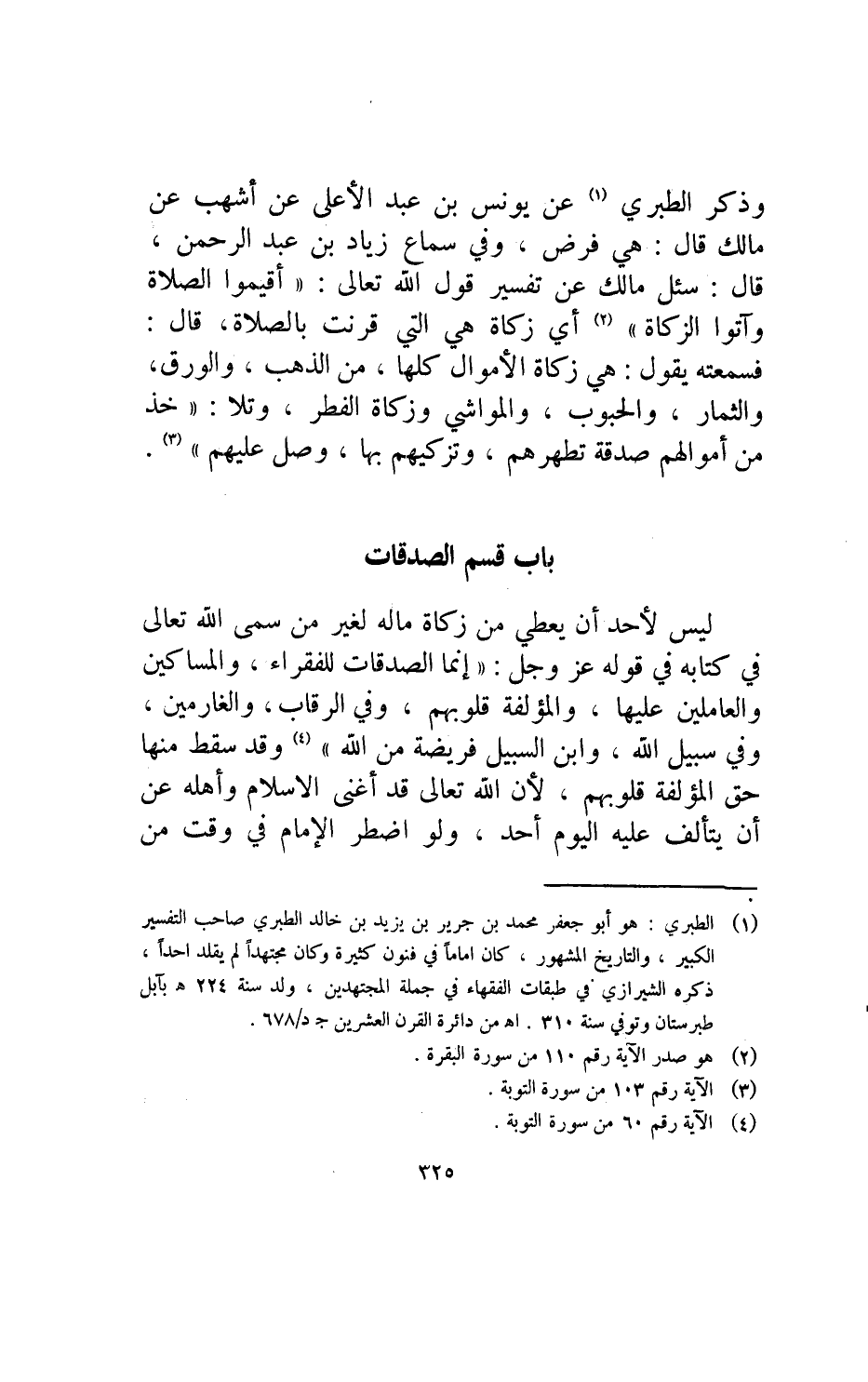 وذكر الطبري عن يونس بن عبد الأعلى عن اشعب عن مالك قال: حتى فرض وفي سماع زياد بن عبد الرحمن قال: سئل مالك عن تفسير قول الله تعالى: {وَأَقِيمُوا الصَّلاةَ وَآتُوا الزَّكَاةَ} أي زكاة هي التي قرنت بالصلاة.
