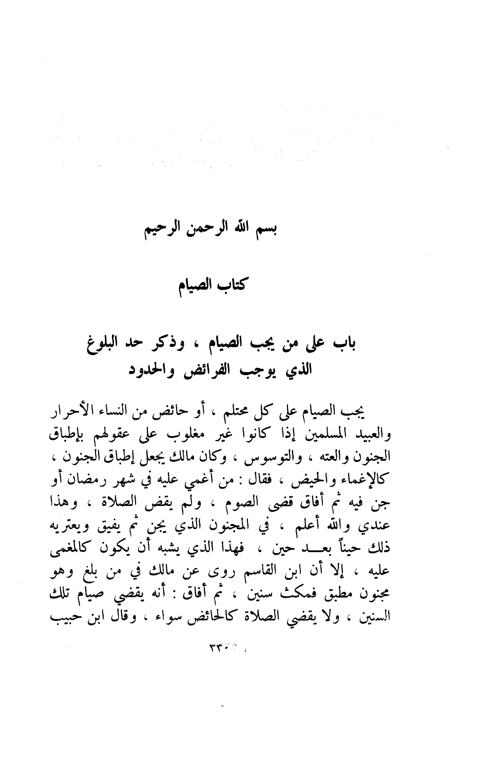 يجب الصيام على كل محتلم أو حائض من النساء الأحرار والعبيد المسلمين إذا كانوا غير مغلوب على عقولهم بإطباق الجنون والعته والتوسوس وكان مالك يجعل إطباق الجنون كالإغماء والحيض فقال: من أغمي عليه في شهر رمضان أو جن فيه ثم أفاق قضى الصوم ولم يقض الصلاة وهذا عندي والله أعلم في المجنون الذي يجن ثم يفيق ويعتريه ذلك حينا بعد حين فهذا الذي يشبه أن يكون كالمغمى عليه، إلا أن ابن القاسم روى عن مالك في من بلغ وهو مجنون مطبق فمكث سنين ثم أفاق أنه يقضي صيام تلك السنين ولا يقضي الصلاة كالحائض سواء.