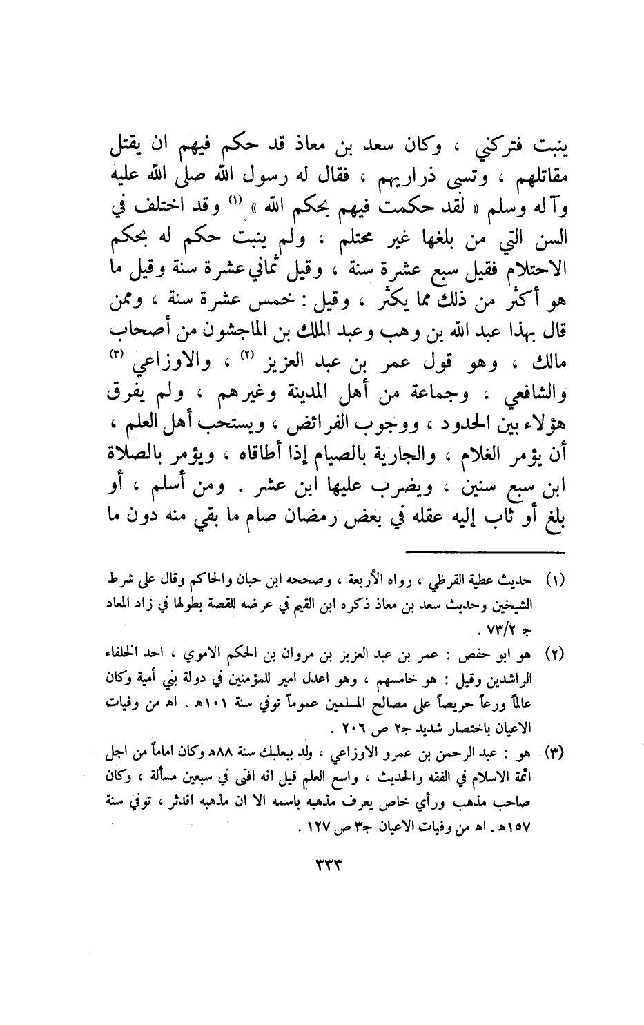 ينبت فتركني وكان سعد بن معاذ قد حكم فيهم أن يقتل مقاتلهم وتسبى ذراريهم فقال له رسول الله صلى الله عليه وآله وسلم: "لقد حكمت فيهم بحكم الله" وقد اختلف في السن التي من بلغها غير محتلم ولم ينبت حكم له بحكم الاحتلام فقيل: سبع عشرة سنة وقيل: ثماني عشرة سنة وقيل: ما هو أكثر من ذلك مما يكثر وقيل: خمس عشرة سنة. وممن قال بهذا عبد الله بن وهب وعبد الملك بن الماجشون من أصحاب مالك وهو قول عمر بن عبد العزيز والأوزاعي والشافعي وجماعة من أهل المدينة وغيرهم ولم يفرق هؤلاء بين الحدود ووجوب الفرائض ويستحب أهل العلم أن يؤمر الغلام والجارية بالصيام إذا أطاقاه ويؤمر بالصلاة ابن سبع سنين ويضرب عليها ابن عشر.