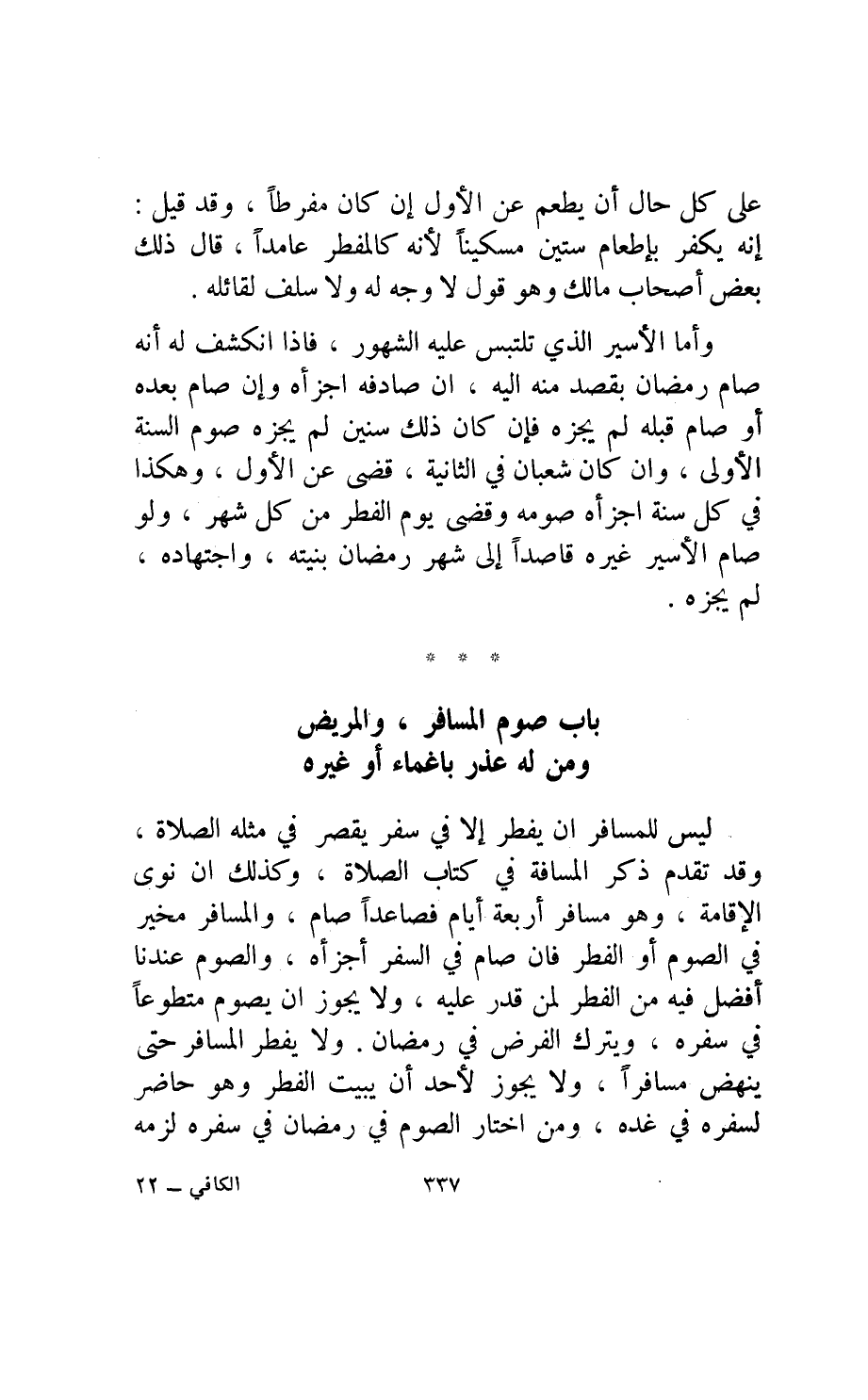 ليس للمسافر أن يفطر إلا في سفر يقصر في مثله الصلاة وقد تقدم ذكر المسافة في كتاب الصلاة وكذلك ان نوى الإقامة وهو مسافر أربعة أيام فصاعدا صام والمسافر مخير في الصوم أو الفطر فإن صام في السفر أجزأه والصوم عندنا أفضل فيه من الفطر لمن قدر عليه ولا يجوز أن يصوم متطوعا في سفره ويترك الفرض في رمضان.