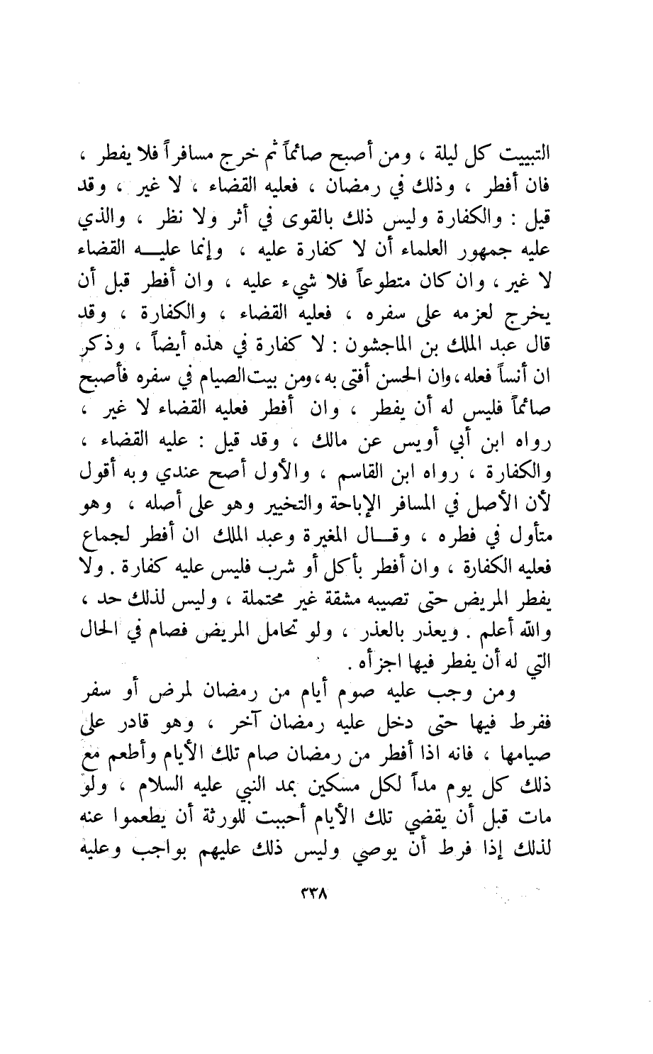 وقد قال عبد الملك بن الماجشون: لا كفارة في هذه أيضا وذكر أن أنسا فعله وان الحسن أفتى به ومن بيت الصيام في سفره فأصبح صائما فليس له أن يفطر وإن أفطر فعليه القضاء لا غير رواه ابن أبي أويس عن مالك.