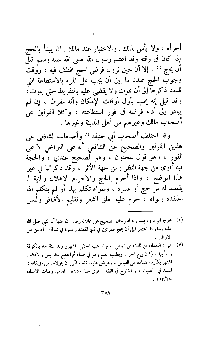 وقد اختلف أصحاب أبي حنيفة وأصحاب الشافعي على هذين القولين والصحيح عن الشافعي أنه على التراخي لا على الفور وهو قول سحنون وهو الصحيح عندي والحجة فيه أقوى من جهة النظر ومن جهة الأثر وقد ذكرتها في غير هذا الموضع وإذا أحرم بالحج والإحرام الإهلال والنية لما يقصد له من حج أو عمرة وسواء تكلم بهذا أو لم يتكلم إذا اعتقده ونواه حرم عليه حلق الشعر وتقليم الأظافر ولبس