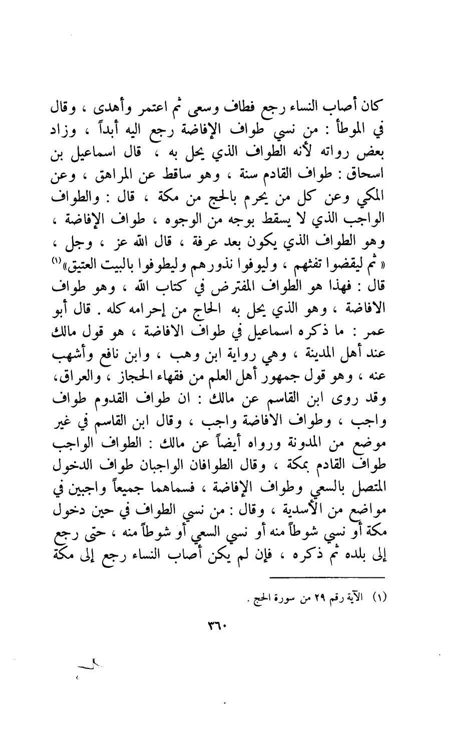 قال: والطواف الواجب الذي لا يسقط بوجه من الوجوه طواف الإفاضة وهو الطواف الذي يكون بعد عرفة قال الله عز وجل: {ثُمَّ لْيَقْضُوا تَفَثَهُمْ وَلْيُوفُوا نُذُورَهُمْ وَلْيَطَّوَّفُوا بِالْبَيْتِ الْعَتِيقِ} .