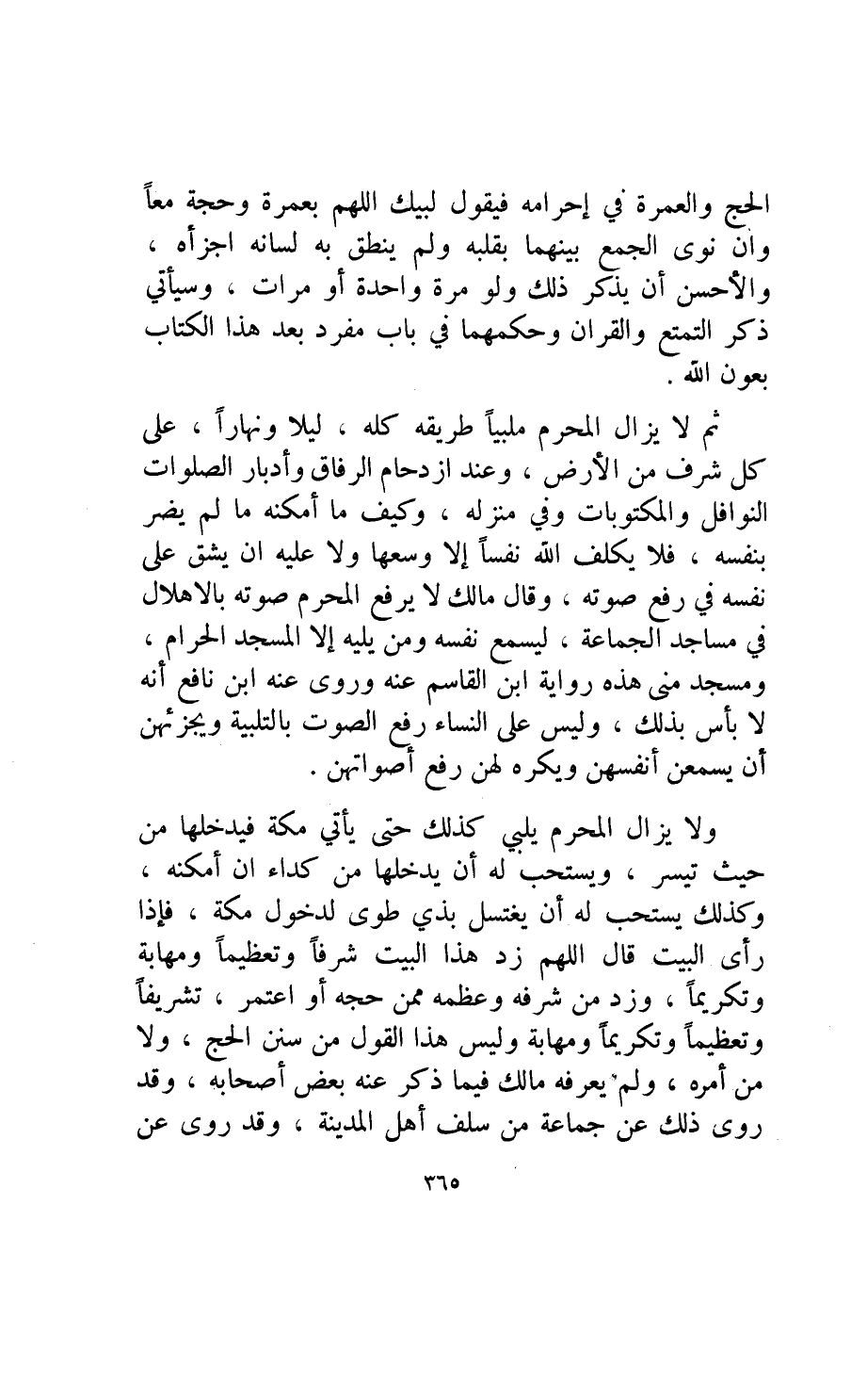 ثم لا يزال المحرم ملبيا طريقه كله ليلا ونهارا على كل شرف من الأرض وعند ازدحام الرفاق وأدبار الصلوات النوافل والمكتوبات وفي منزله وكيف ما أمكنه ما لم يضر بنفسه فلا يكلف الله نفسا إلا وسعها ولا عليه ان يشق على نفسه في رفع صوته.