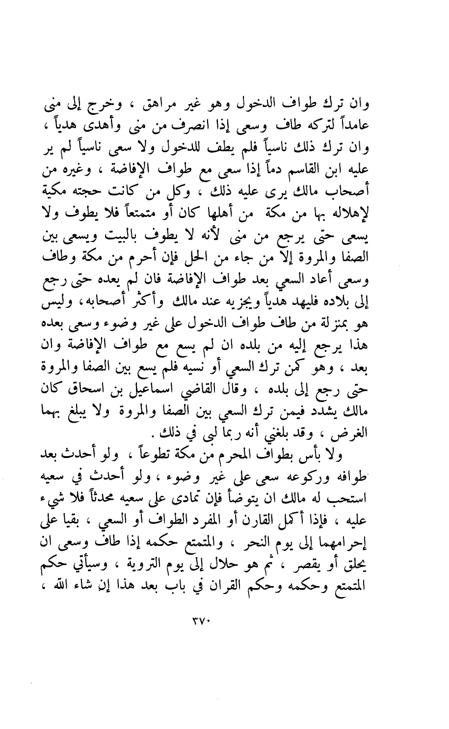 ولا بأس بطواف المحرم من مكة تطوعا ولو أحدث بعد طوافه وركوعه سعى على غير وضوء ولو أحدث في سعيه استحب له مالك ان يتوضأ فإن تمادى على سعيه محدثا فلا شيء عليه فإذا أكمل القارن أو المفرد الطواف أو السعي بقيا على إحرامهما إلى يوم النحر والمتمع حكمه إذا طاف وسعى أن يحلق أو يقصر ثم هو حلال الى يوم الرويه وسيأتي حكم المتمتع وحكمه وحكم القران في باب بعد هذا إن شاء الله.