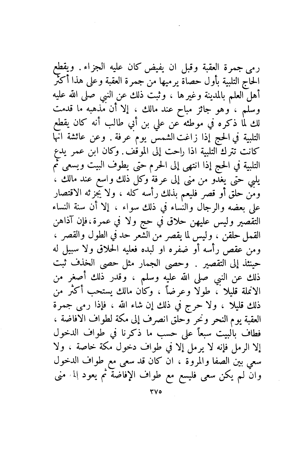 وحصى الجمار مثل حصى الخذف ثبت ذلك عن النبي صلى الله عليه وسلم وقدر ذلك أصغر من الانمله قليلا طولا وعرضا وكان مالك يستحب أكثر من ذلك قليلا ولا حرج في ذلك إن شاء الله فإذا رمى جمرة العقبة يوم النحر ونحر وحلق انصرف إلى مكة لطواف الافاضة فطاف بالبيت سبعا على حسب ما ذكرنا في طواف الدخول إلا الرمل فإنه لا يرمل إلا في طواف دخول مكة خاصة ولا سعي بين الصفا والمروة ان كان قد سعى مع طواف الدخول وان لم يكن سعى فليسع مع طواف الإفاضة ثم يعود إلى منى