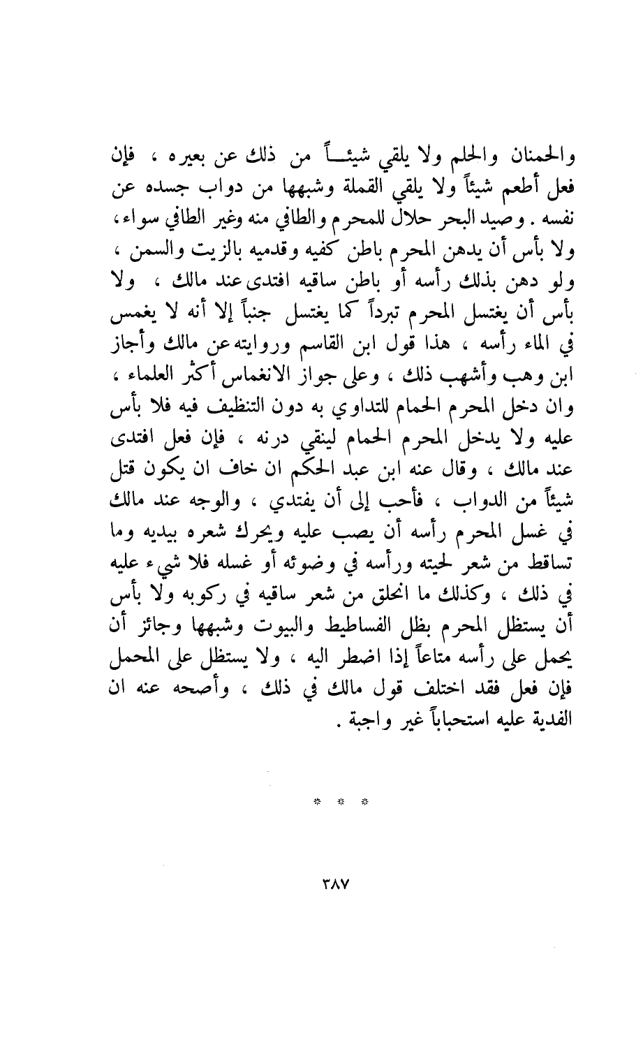 وصيد البحر حلال للمحرم والطافي منه وغير الطافي سواء ولا بأس أن يدهن المحرم باطن كفيه وقدميه بالزيت والسمن ولو دهن بذلك رأسه أو باطن ساقيه افتدى عند مالك ولا بأس أن يغتسل لمحرم تبردا كما يغتسل جنبا إلا أنه لا يغمس في الماء رأسه هذا قول ابن القاسم وروايته عن مالك وأجاز ابن وهب وأشهب ذلك وعلى جواز الانغماس أكثر العلماء وإن دخل المحرم الحمام للتداوي به دون التنظيف فيه فلا بأس عليه ولا يدخل المحرم الحمام لينقي درنه فإن فعل افتدى عند مالك.