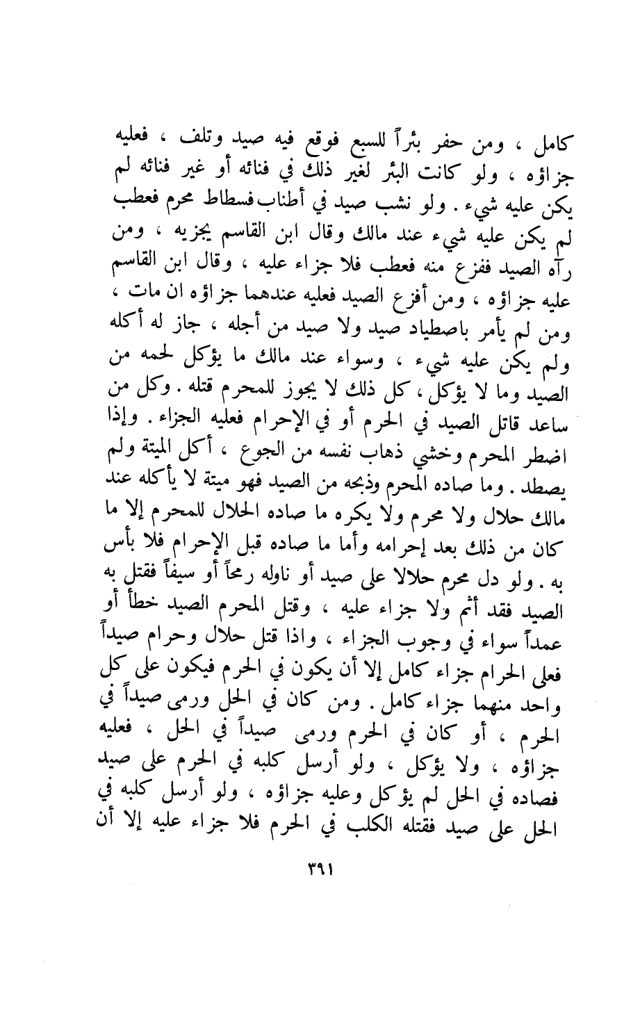 كامل ومن حفر بئرا للسبع فوقع فيه صيد وتلف فعليه جزاؤه ولو كانت البئر لغير ذلك في فنائه أو غير فنائه لم يكن عليه شيء.