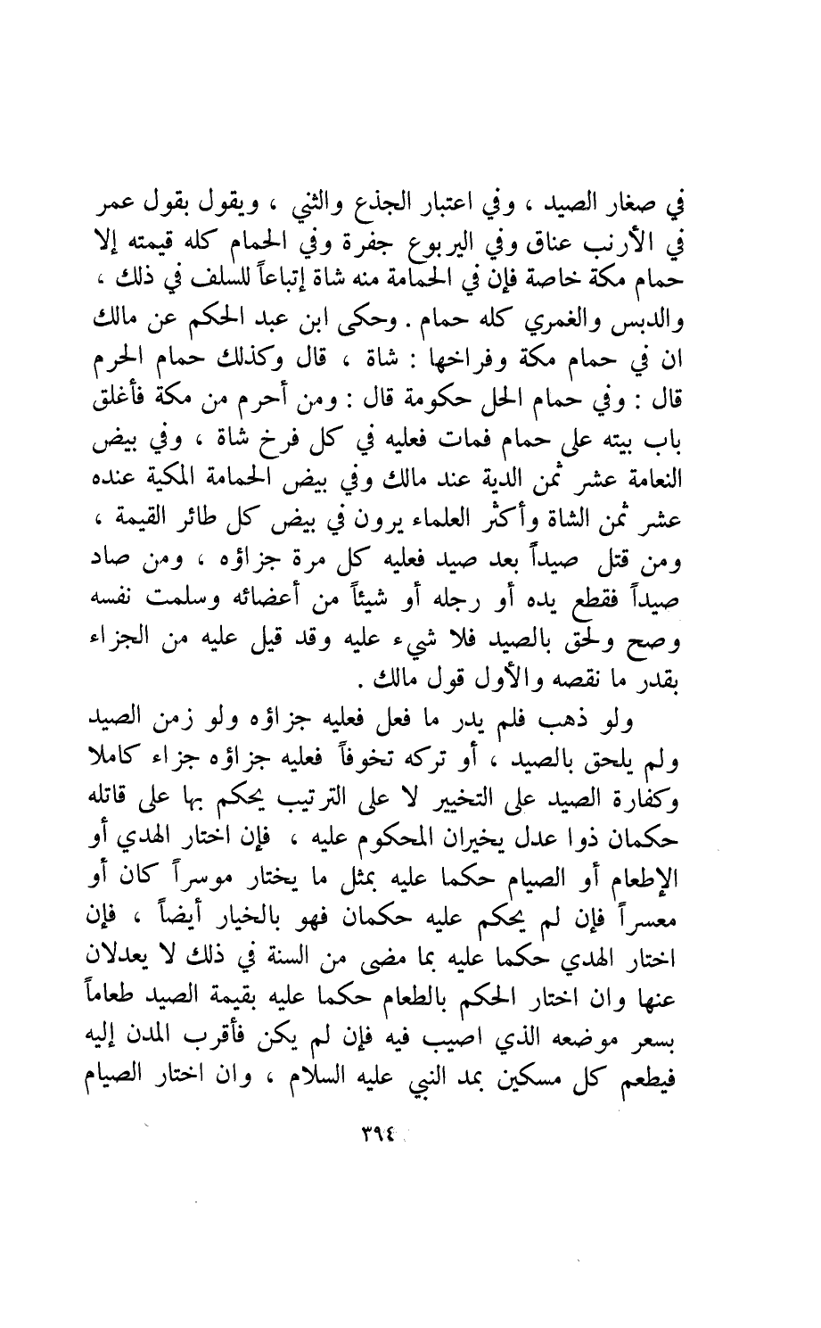 وحكى ابن عبد الحكم عن مالك ان في حمام مكة وفراخها: شاة، قال: وكذلك حمام الحرم قال: وفي حمام الحل حكومة قال: ومن أحرم من مكة فأغلق باب بيته على حمام فمات فعليه في كل فرخ شاة وفي بيض النعامة عشر ثمن الدية عند مالك وفي بيص الحمامة المكية عنده عشر ثمن الشاة وأكثر العلماء يرون في بيض كل طائر القيمة ومن قتل صيدا بعد صيد فعليه كل مرة جزاؤه ومن صاد صيدا فقطع يده أو رجله أو شيئا من أعضائه وسلمت نفسه وصح ولحق بالصيد فلا شيء عليه وقد قيل عليه من الجزاء بقدر ما نقصه والأول قول مالك.