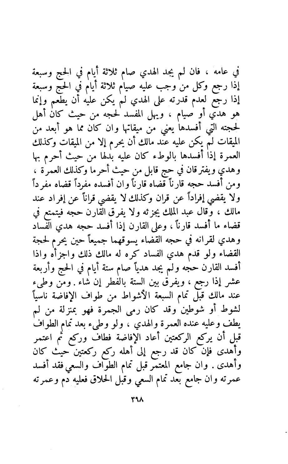 في عامه فإن لم يجد الهدي صام ثلاثة أيام في الحج وسبعة إذا رجع وكل من وجب عليه صيام ثلاثة أيام في الحج وسبعة إذا رجع لعدم قدرته عل الهدي لم يكن عليه أن يطعم وإنما هو هدي أو صيام ويهل المفسد لحجه من حيث كان أهل لحجته التي أفسدها يعني من ميقاتها وإن كان مما هو أبعد من الميقات لم يكن عليه عند مالك أن يحرم إلا من الميقات وكذلك العمرة إذا أفسدها بالوطء كان عليه بدلها من حيث أحرم بها وهدي ويفترقان في حج قابل من حيث أحرما وكذلك العمرة ومن أفسد حجه قارنا قضاه قارنا وإن أفسده مفردا قضاه مفردا ولا يقضي إفرادا عن قران وكذلك لا يقضي قرانا عن إفراد عند مالك وقال عبد الملك يجزئه ولا يفرق القارن حجه فيتمتع في قضاء ما أفسد قارنا وعلى القارن إذا أفسد حجه هدي الفساد وهدي لقرانه لحجة القضاء يسوقهما جميعا حين يحرم لحجة القضاء ولو قدم هدي الفساد كره له مالك ذلك وأجزأه وإذا أفسد القارن حجه ولم يجد هديا صام ستة أيام في الحج وأربعة عشر إذا رجع ويفرق بين الستة بالفطر إن شاء.