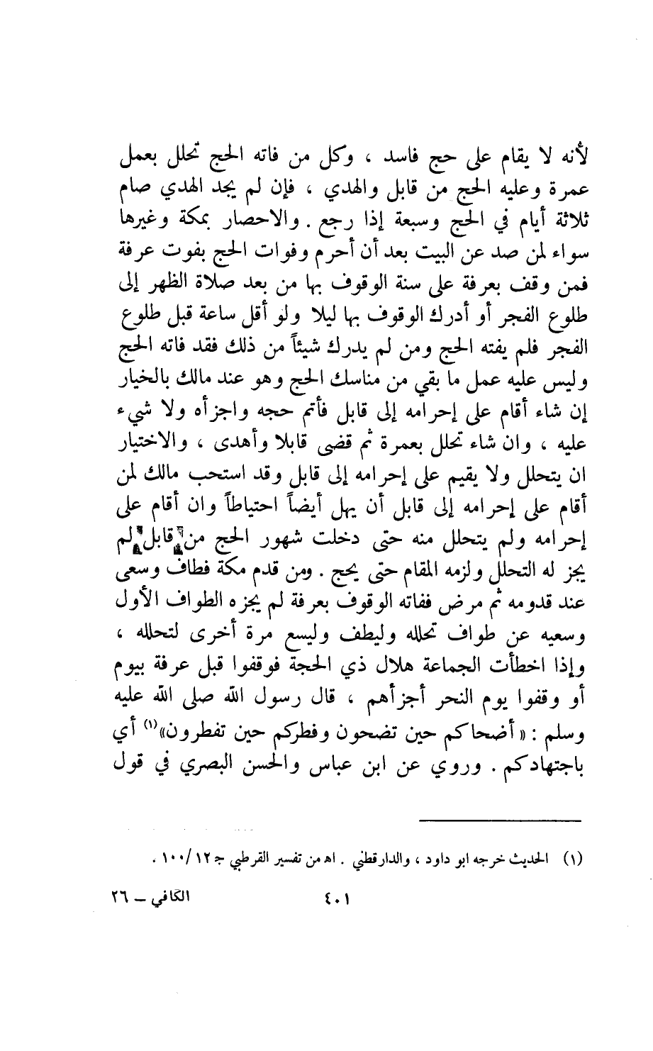 ومن قدم مكة فطاف وسعى عند قدومه ثم مرض ففاته الوقوف بعرفة لم يجزه الطواف الأول وسعيه عن طواف تحلله وليطف وليسع مرة أخرى لتحلله وإذا أخطأت الجماعة هلال ذي الحجة فوقفوا قبل عرفة بيوم أو وقفوا يوم النحر أجزأهم قال رسول الله صلى الله عليه وسلم: "أضحاكم حين تضحون وفطركم حين تفطرون" أي باجتهادكم.